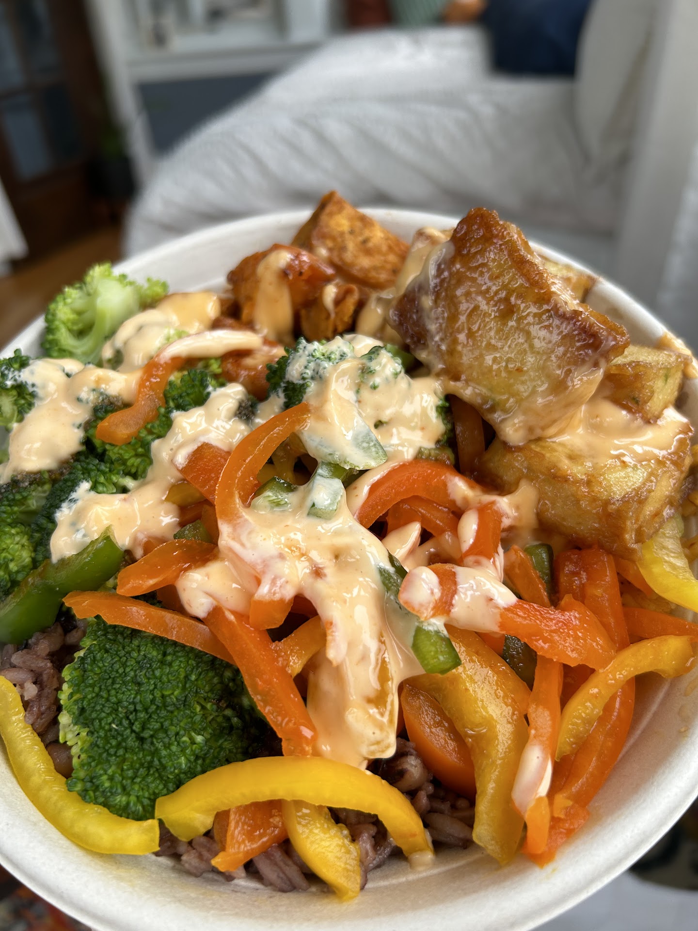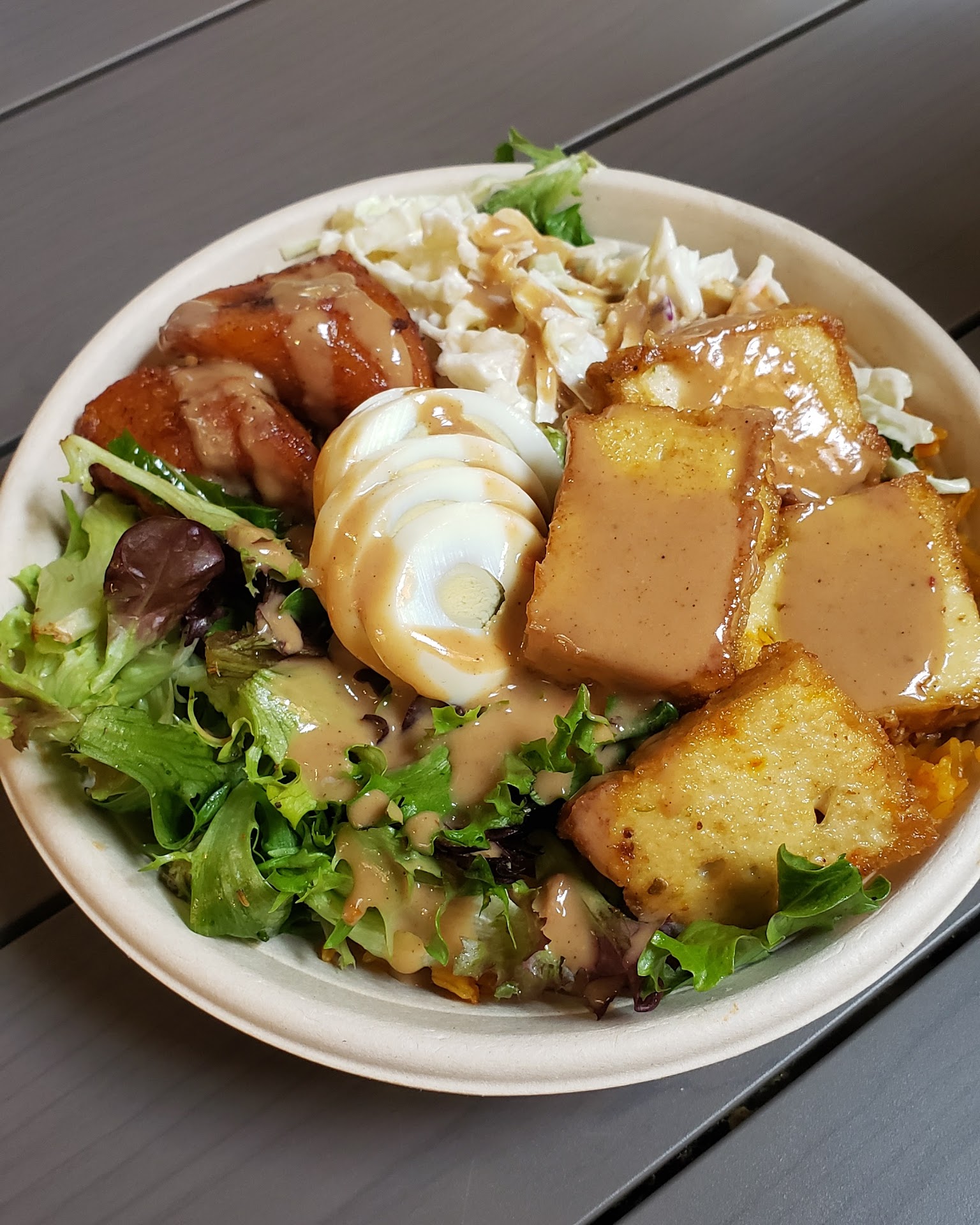 I'm salivating just thinking about this meal. Each piece of tofu was fat and oh-so-juicy - absolute perfection. The jollof rice was soft and had so much flavor from the spices, and the hard-boiled egg was surprisingly not dry. I absolutely loved the sauce that was generously drizzled over all the ingredients.