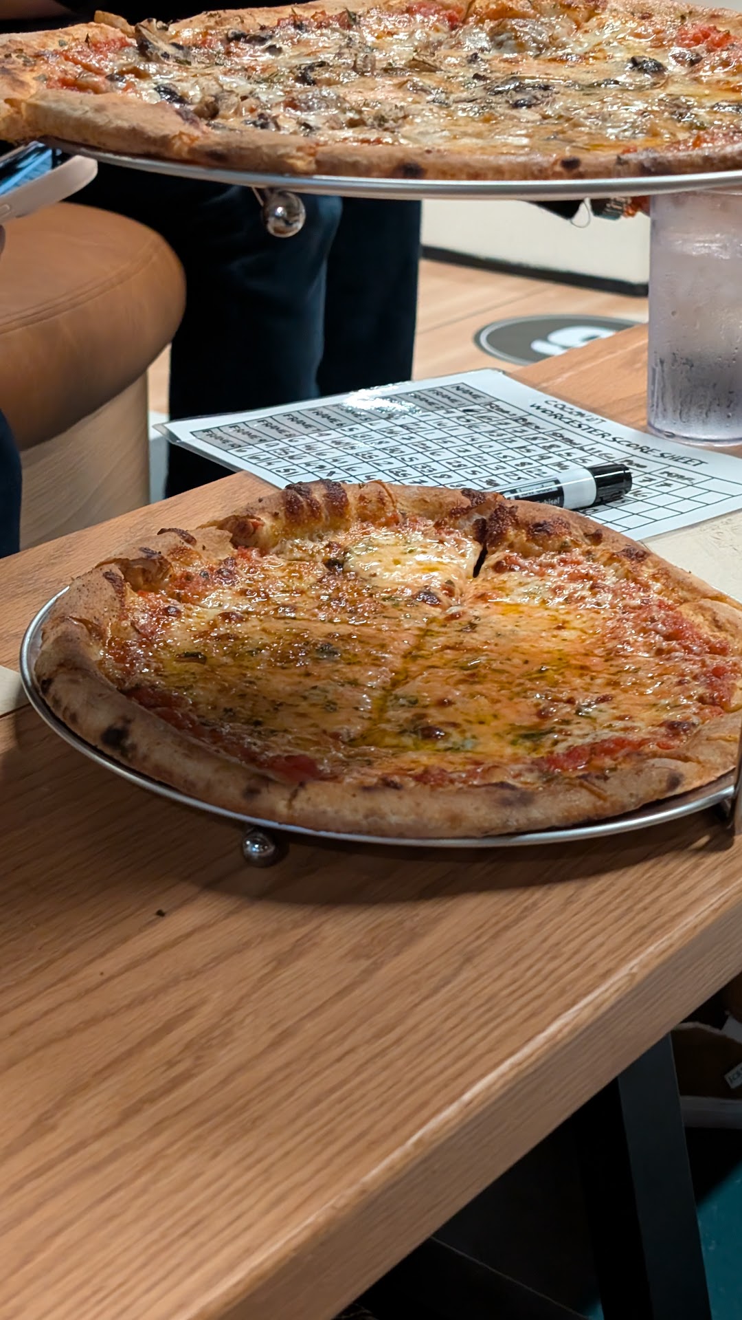 I enjoyed how the restaurant is separated based on what kind of experience you want. The upstairs is clean, spacious and more quiet if you just want to hang and eat without bowling. The kids loved looking at the big pizza oven where the food was being made! Downstairs is candlepin bowling with a large bar behind it. You can either order and have the food/drinks brought to your bowling lane or choose to sit at a regular table without bowling.