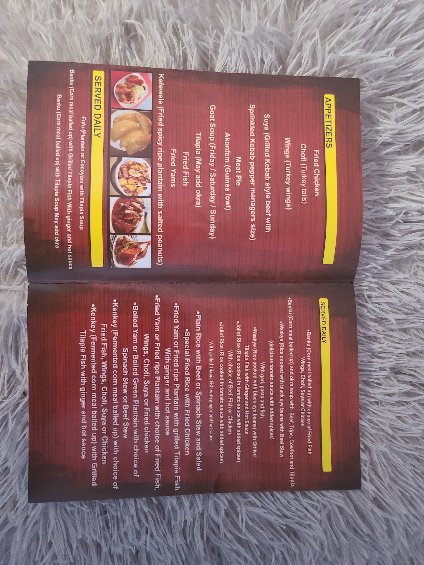If I could give this place a negative star I would, but google doesn’t allow you to post a review without giving a star. I called to order my food the guy who answer the phone was having a different conversation with somebody else while trying to take my order. I had to keep saying hello 5x before I could get his attention. I ordered my food finally my husband went to pick it up he said he stood there waiting for the guy at the register to notice him because his focus was on the television more then the customer standing in front of him. My husband comes back with the food and I open it taste the food and it’s wrong I ordered peanut soup and they give my husband palm nut soup. I called to informed them the guy who answer the phone tells me they don’t have no peanut soup so I said then why when my husband asked for my peanut soup he wasn’t informed that there were none? His reply was I don’t know. So I asked to speak with the manager and he tells me the supervisor isn’t available. He then give the phone to another guy who comes on the phone and argue with me about what I’m eating. This is my first and last time getting food from this establishment. If I was allergic to palm nut I would’ve had a terrible reaction. This is the first establishment where I call as a customer to complain and I’m arguing with the employees and no apology was offered nothing except “ok we don’t know how it happen” terrible customer service. This is exactly why African restaurants don’t stay open long. This is experience for me was horrible I don’t recommend this place. To whoever that runs this place you need to talk to your employees about customer service and turn the television off because apparently the television is more important...