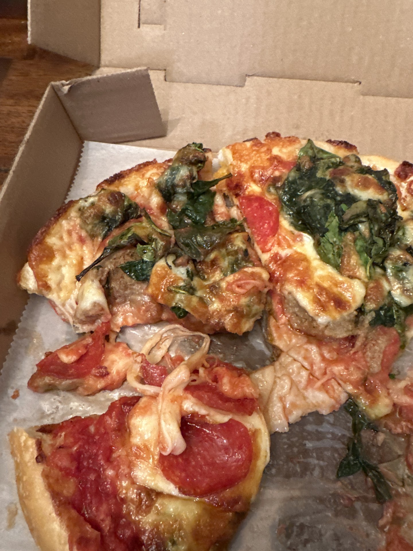 But the pizza is the important part. On the drive home the smells drifting from the pizza reminded me of a typical Greek pizza so disappointment started to set in. At home opening the box, yup yet another typical Greek bready pizza. The more of this quest we are doing the more we wished we lived in NY. Anyways for a Greek pizza it tasted alright. The crust was cooked correctly and bread flavor the sauce was nothing special but a bit sweet.
