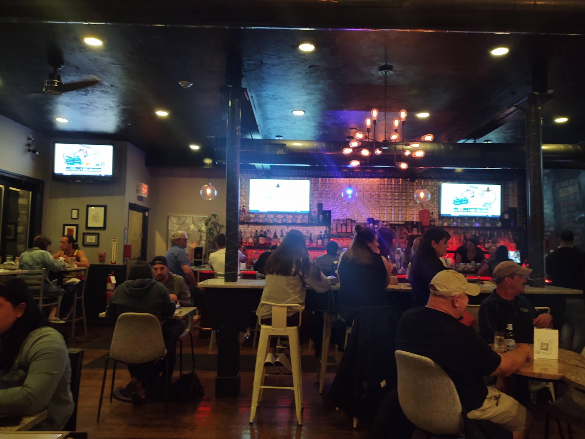 I'm not exactly sure what type of restaurant this is intended to be - sports bar? swanky lounge? American hipster? Mediterranean? There is an amalgamation of themes here. Not like that makes or break it, but it does give some ambience. Also they had music playing (SO loud) and it went from country to hip hop to pop to punk rock...just confusing. The drinks we ordered were just OK; I got the Freshyyy which I wasn't a total fan of, but the bartender was very nice and helpful. He ended up making me a solid old fashioned. Finally, the food was also just OK. I got the shrimp burger and my girlfriend got the falafel burger in a pita. The shrimp burger was weird in a good way (never had shrimp in a patty), but it could have used some crunch (the chef came over and mentioned adding red cabbage slaw---- I agree!!). My gf thought the falafel was "pretty good". We both agreed that it would have been nice if the food came on something other than these huge metal trays - just because the table was kind of small.