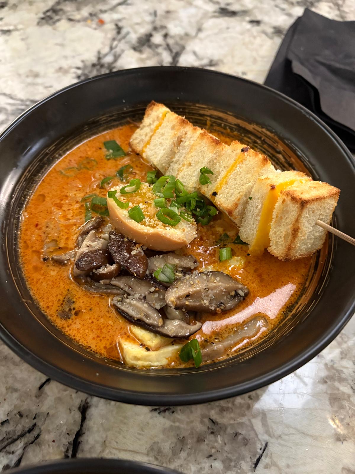 Read moreObviously an establishment is under no obligation to supply vegetarian options. However, if you choose to offer them they should probably not taste like an obligation. Grilled cheese ramen? I was curious, and further drawn by the lack of meat. However, it's obvious that no herbivore was consulted when the menu was proposed; It doesn't taste like ramen, doesn't taste like tomato soup, and I'm left wondering what I paid $13 for. Were the silky tofu cubes added because it doesn't contain a protein? Thanks, but maybe add something with texture or flavor instead. I did appreciate the quartered tomato that was supplied; it reminded me what I thought I signed up for.