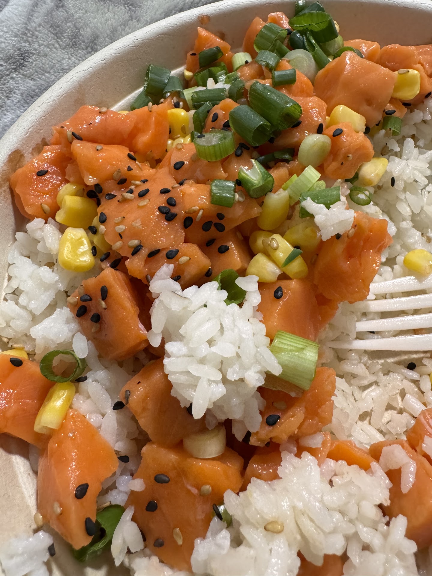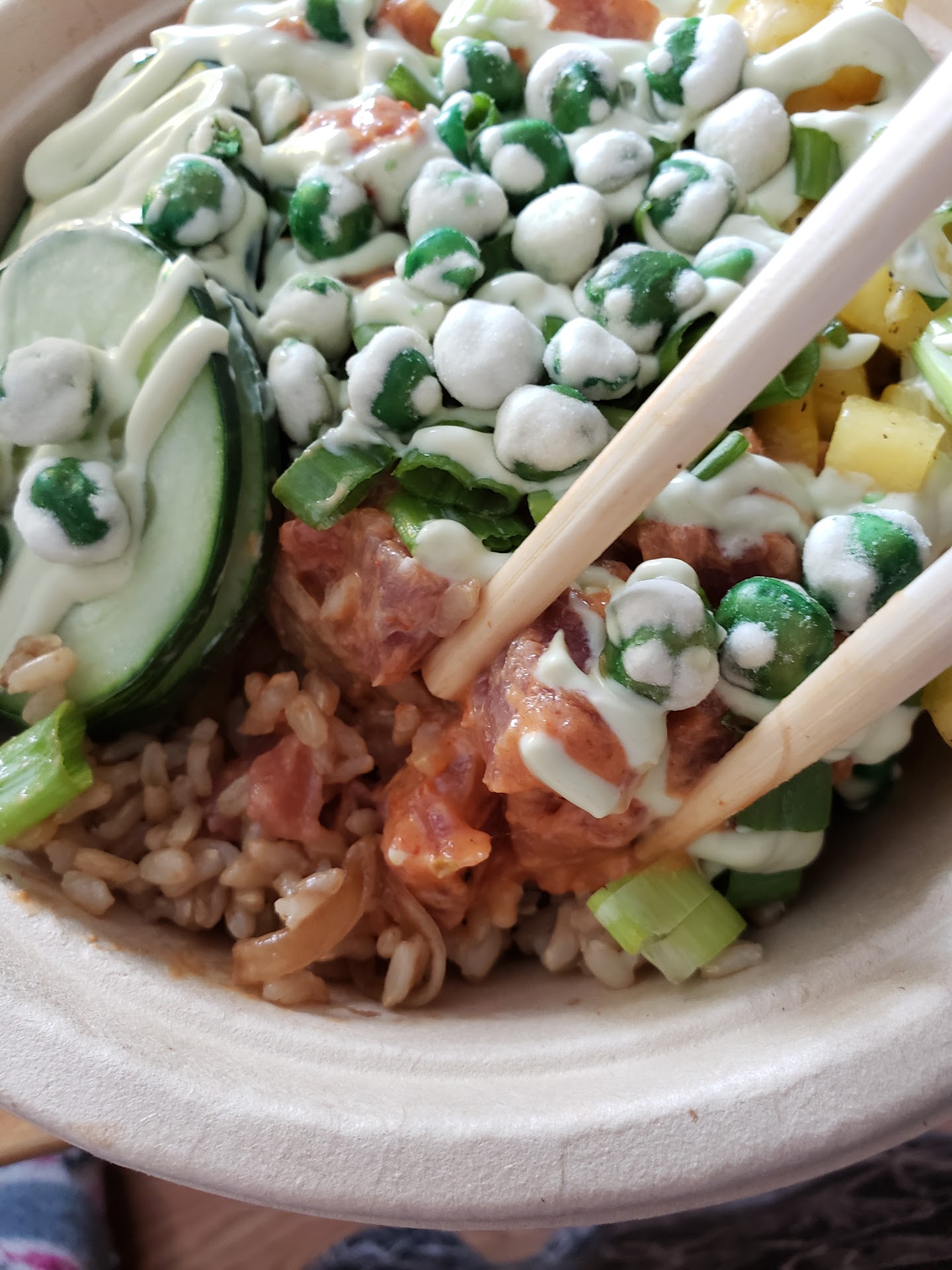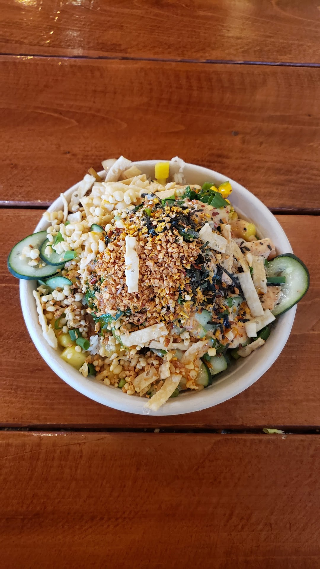 Well, anyway, I was there and hungry so I decided to order. I did like that the bowl came with 3 scoops of protein, and there was a tofu option in case someone doesn't want fish (but came to a poke place anyway). They heaped on the toppings, and the bowl ended up huge and overflowing, which was fantastic. However, that couldn't change the fact that the ingredients just didn't taste good. The white rice was hard, and the mixed vegetables were cooked fajita-style, which just did not go with the flavors of the rest of the bowl at all. In fact, there were several Mexican-themed (why would you do that at a poke place!) sauces and toppings; to each their own, but I would stay as far away from those as possible as it overpowers the taste of the fish, which should be the actual star of the show.