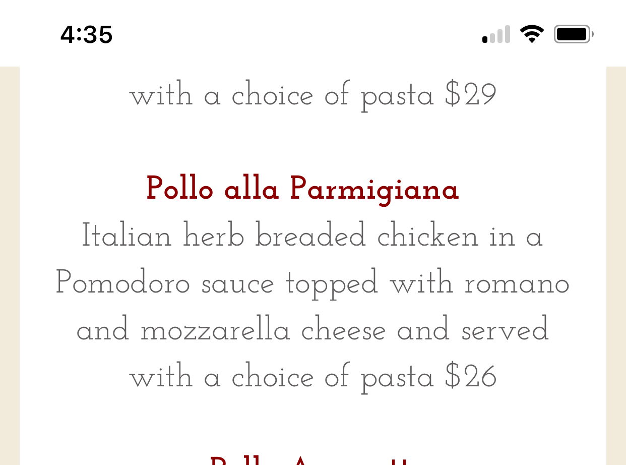 Read moreI wanted chicken parm tonight , so I googled a few places I never ordered from before. This place came up and I read good reviews so I decided to call and order . When I called I told host that I never ordered from there before and I wanted the chicken parm dinner. I asked if it came with enough cheese or sauce she said the way it comes gas enough . With that answer I knew I had to ask for extra cheese and sauce which I did. When I picked it up I also asked if I could get some Parmesan cheese crumbles in a cup . She gave me a weird look and said there is already cheese on the chicken, I told her no that is not what I was asking . I wanted the Parmesan crumbles . So she went to the kitchen abd brought out my food , I saw a small container of sauce and Parmesan. It looked right so I came home with it, when I opened it did not look right . I thought I ordered the pollo Ala Parmesan dinner this was supposed to be Italian herbs and pomodoro sauce and there was hardly any sauce on the dish and the little container of extra sauce they gave me wasn’t enough. I am willing to pay for extra sauce .