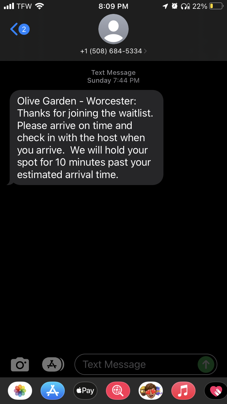 We left and called the restaurant to test if the employees at the front desk were being truthful about the wait time. When I got on the phone with an employee on the phone, I asked, “Do you currently have a wait time?” The employee on the phone then seemed to ask one of her coworkers if there was a wait time. Then she answered my question. “We have about an hour wait.” I told them that was fine and asked to be put in a waitlist. So my wife, my son and I were out on a waitlist in which we would be texted by phone when our table was ready. I put my name down as Phil, and received a text message saying, “Olive Garden - Worcester: Thanks for joining the waitlist. Please arrive on time and check in with the host when you arrive. We will hold your spot for 10 minutes past your estimated arrival time.” So we waited a full hour.