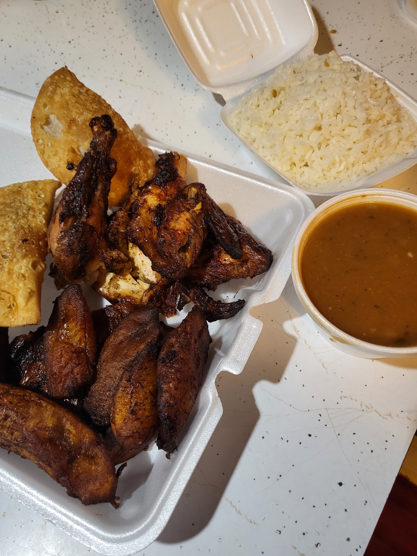 For the food: it was all sitting in steam table pans as like in a buffet. The grilled chicken and tostones were severely dry to a point actually dipped my chicken in ketchup!! I fed the tostones to my dog, who then went and drank water š¤£. I was told they do not have rice and beans, but then was told they have rice with either veggies or beans??? So rice and beans were very dry, some of it was even crunchy š.. that will go to the dogs as well. We ordered ribs, which were also very dry and over priced. We did also buy a flan to share, it was not bad.. Miranda breadās flan is much better..