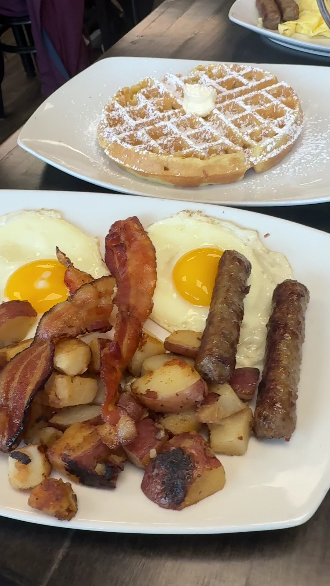 🍽️ Food & Drinks We both ordered the #2 combo, which comes with eggs, bacon, sausage, and pancakes, but I opted to switch mine for a Belgian waffle. The eggs were cooked just right, the bacon was crispy, and the sausage had a rich, savory flavor. The Belgian waffle was a great swap—it was light and fluffy, with a golden, crispy exterior that paired perfectly with syrup. The hot chocolate was also a highlight, offering a sweet and comforting treat that made the meal even more enjoyable.