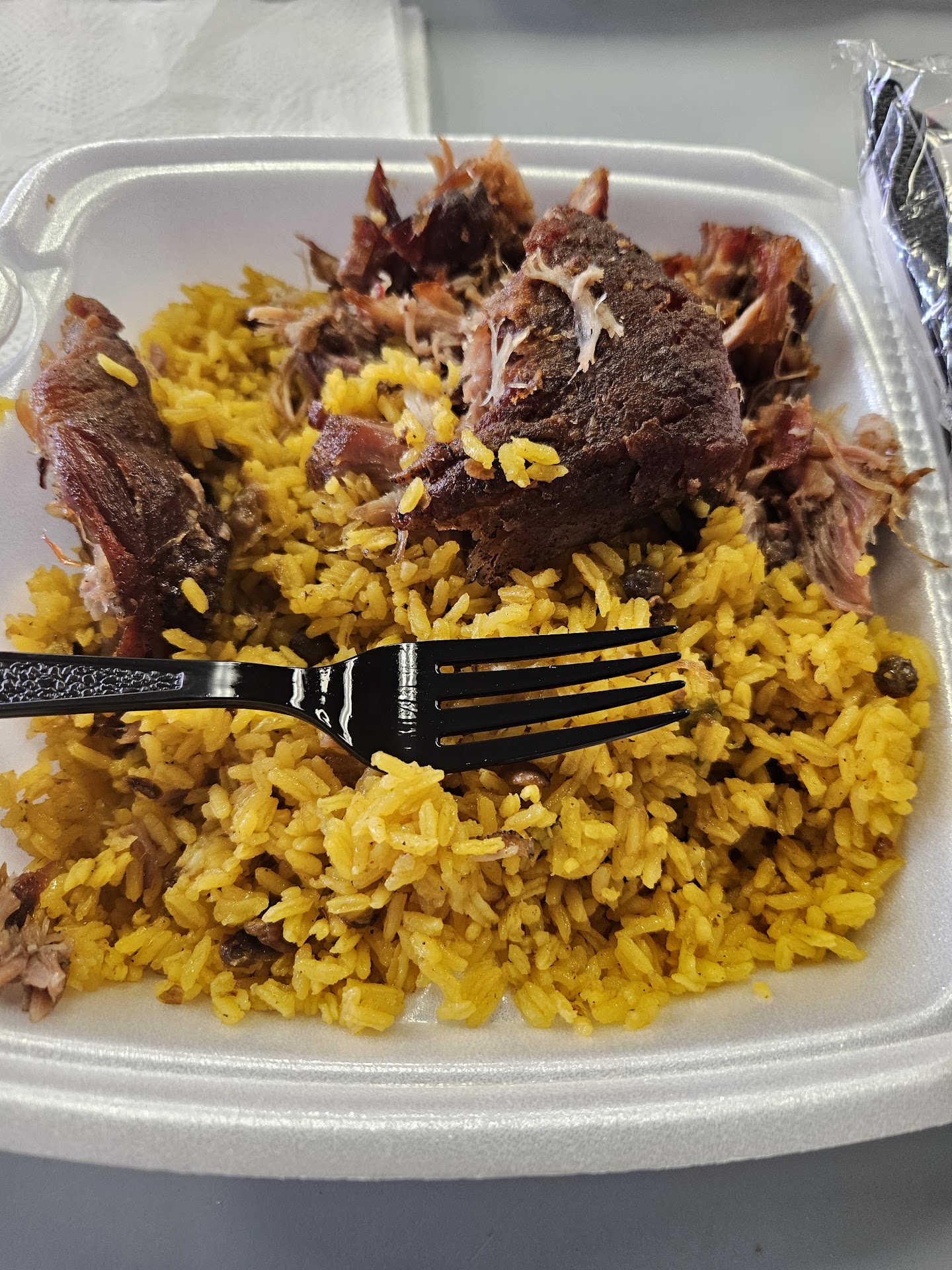 Comida deliciosa...I walked up to Sazon and so many good smells filled the air before even walking in. I went with 3 friends, including a ringer...J.R. grew up in a PR family in NYC and suggested this place...we walked in and immediately got into line...this is a busy place around lunch time...but that means that is good. The line moved fast. I went with a true standard of Puerto Rico Cooking; Arroz con gandules with pernil. What? I know it is like Christmas/Noche Buena/Thanksgiving in May! The Pernil is for those who have missed out on a joyous life: beautifully season pork typically shoulder (garlic, oregano, salt and some other marinade seasons I could not tell). The server was cool because I like pernil crujiente. So got me some crispy parts. This pernil was paired the with yellow rice (pigeon peas in the rice). Sazon makes an absolutely delicious pernil, crispy yet juicy and deeply satisfying. A plus... Go eat it...do it...They offer for $11 for a small or $13 for a large. I went with the large. I had a red can cola. The meal was epic. ($14.05). Plastic ware came along with napkins. The portions are gigantic, but so good. Only one of my companions finished his. The rest of us took ours home. It did not hold up great as take away. EAT IT ALL THERE!!!