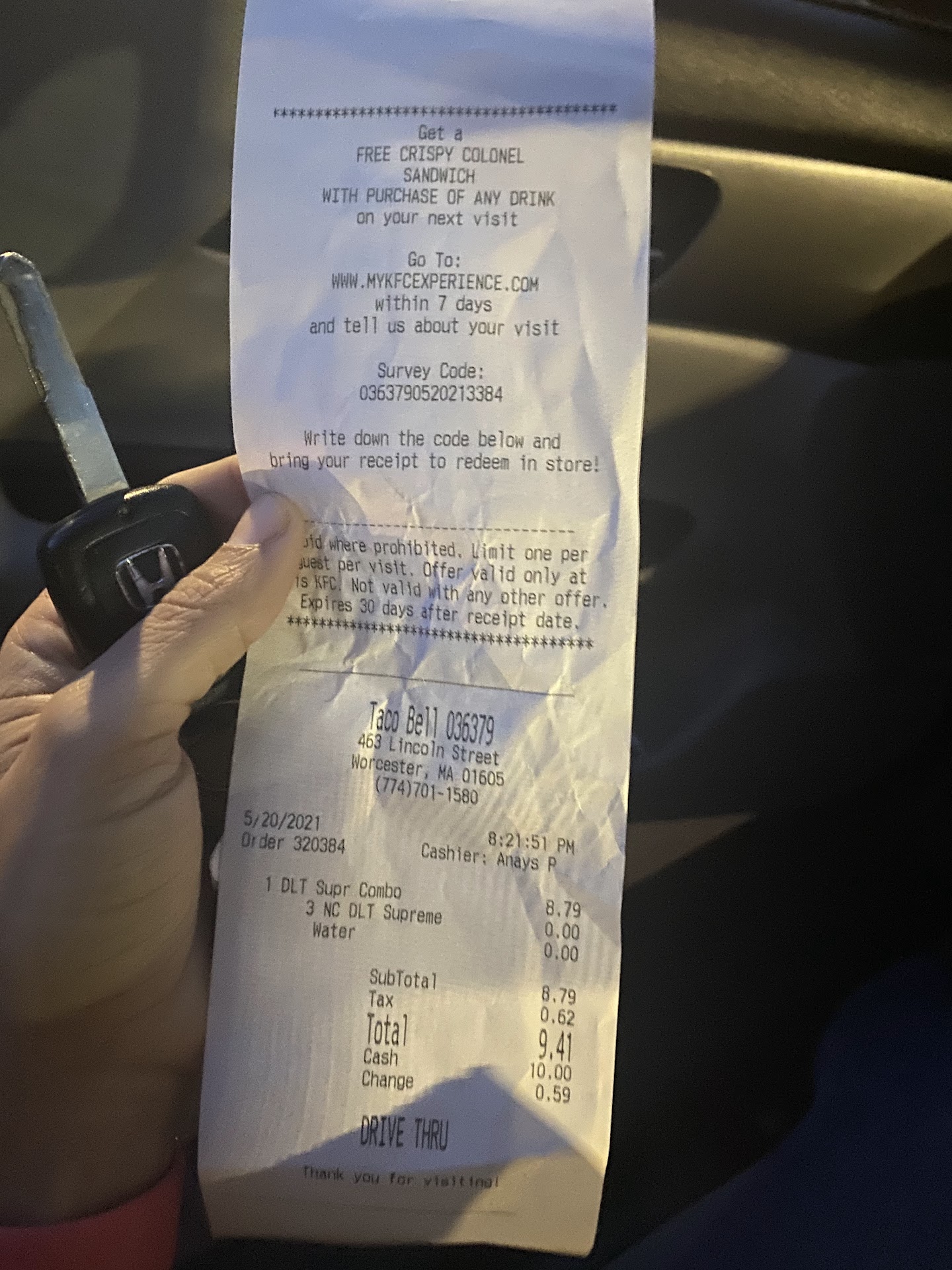 Read moreWORST absolute WORST Taco Bell I have ever been to.We actually live about 30 seconds from this location. If we want Taco Bell we will drive all the way to Shrewsbury to avoid coming here. Plan to wait anywhere between 20 minutes to a half an hour to get your food if it is in the evening. Expect a soggy taco shell and people who don't care for service . I really wish I knew who owned this location, when you spend about $35/40 to feed five people and the food is complete crap you realize you could've cooked a meal at home for as long as it takes to wait in the drive-through line . Not exaggerating. It's been this way for about nine months used to be OK before. Whoever owns and manages the store has no concept of customer service or quality. The McDonald's on Lincoln Street used to be the worst place to go but Taco Bell has now surpassed them. I don't know where they're getting their help from ...? I know you don't get paid a lot but people please take pride in your work you'll never advance in anything you do in life if you can't handle the little stuff. May be too deep for a fast food restaurant, but what the heck I'm writing the review right?! People...