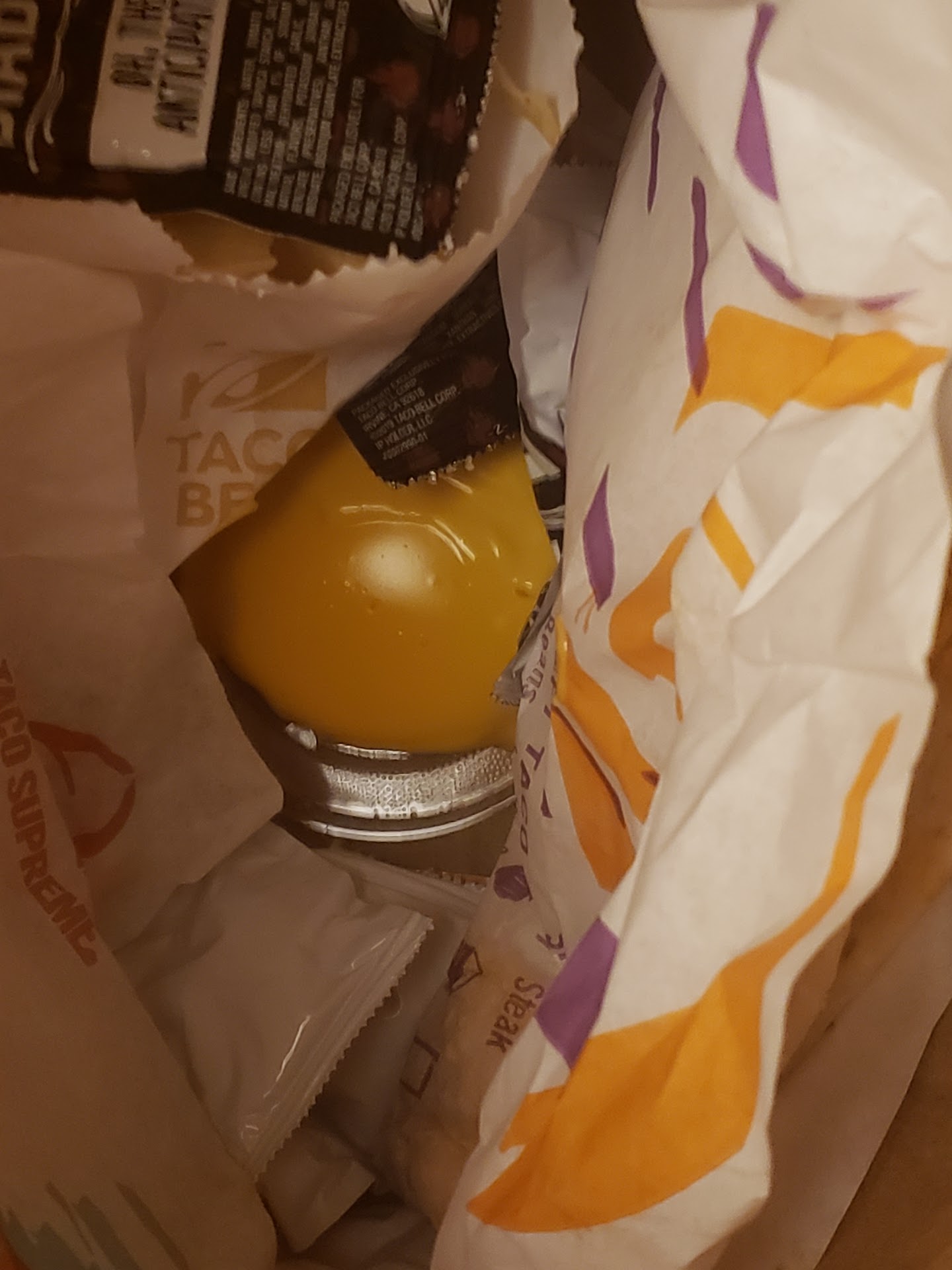 I just ordered GrubHub at 9:30, having ordered a cabana chicken burrito meal with guacamole and a steak soft taco supreme with guacamole and a Baja blast drink. Two old and cold quesadillas, which I couldn't even tell you which kind they were due to the rubber like cheese holding them together, showed up. I swear this Taco Bell is absolutely incapable of putting out fresh hot food. It's as if they're incapable of having even one order come out of this place correct and hot. They probably wanted to close early, so they didn't want to cook a fresh meal (that I paid $27 for), but would rather send me old food they had sitting around, regardless of the fact that this wasn't even my order. My orders God only knows where, probably with the Manarsh's, and I doubt it's fresh bc the meal they sent me that was theirs wasn't fresh. It's like it would kill them to actually do what they're being paid to do. This is what happens when you hire the worst employees you can find for both GrubHub and Taco Bell. They literally find the worst possible employees they can and then hire them. Now I get to fight with GrubHub AND Taco Bell for my money back and I want my tip back, too! I literally told the GrubHub delivery driver that I'm disabled (and I genuinely am, physically) and asked them to bring it inside my porch and knock on my door. My order of communication is to call (which you can see), none of which occurred. As you can see the driver left the order on the outside and in a wide open bag. Btw, That's not a receipt sticking to the bag it's an open 💰 with a sticker sticking up. I didn't get a receipt which is why I had to take screenshots of my GrubHub order. My last name is not Manarsh either, so the driver obviously can't match text from one order to text from another.