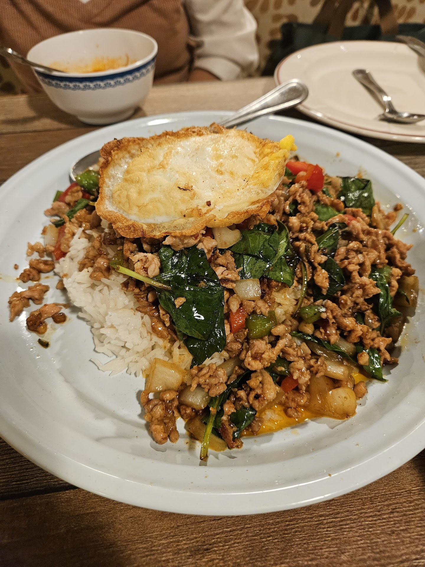 We started with Tom Yum Soup with shrimp, perfectly spiced and a perfect introduction to the tastes to come. We moved on to the crispy Brussels sprouts, which were subtly spiced and perfectly cooked, there is a tendency to undercook, but Thai Corner got them just right. The Thai Soft Spring Rolls are also not to be missed, stuffed with chicken, veggies and basil and accompanied by a delicious sweet and spicy sauce. We ended the appetizer course with the Scallion Pancakes, and again, you hit the nail on the head. Crispy, flaky, light and delicious.