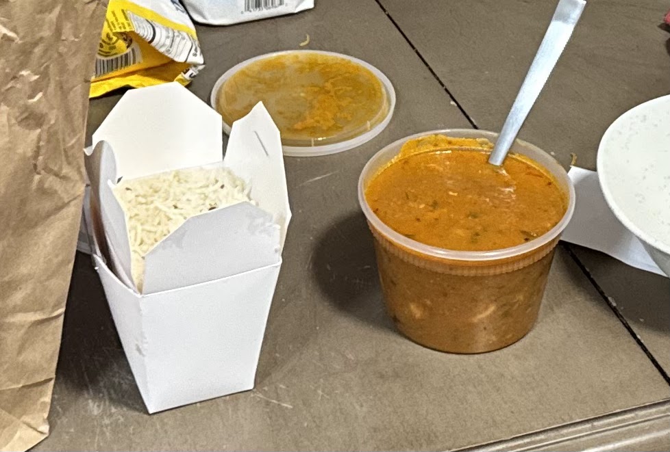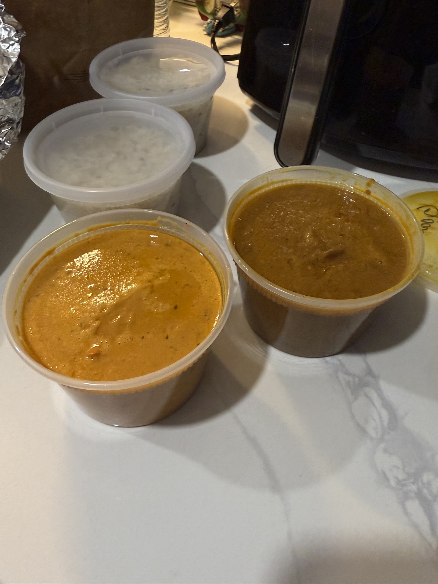 The korma was more egregiously bad in my opinion. Korma is supposed to be an onion-heavy gravy thickened with yogurt and almond flour (or even peanuts if the place is on the cheaper side). There should be pieces of cashew and golden raisins throughout in higher quality places, but sometimes you just get regular old raisins in cheaper places. The chicken should be braised with ghee and spices. But this stuff was clearly tomato-based with no yogurt and no nuts whatever. The chicken was stewed rather than braised, too. The whole effect made it seem like I was eating soggy chicken with a very thin, watery tomato puree. And if they accidentally gave me their butter chicken or tikka masala instead of korma, which I sort of suspect happened, it's still not good and still very wrong.