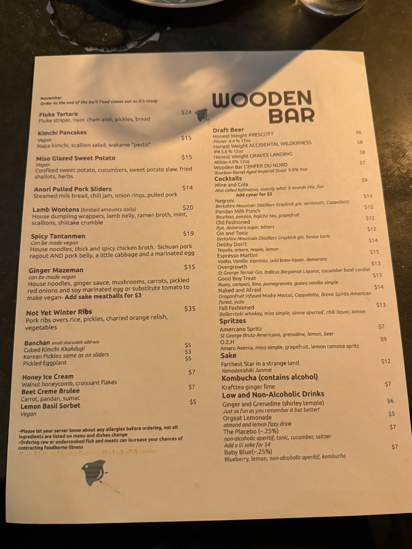 I am usually pretty good at finding the right places to eat for. So much so that people frequently turn to me for recommendations when they need a place for a particular occasion. So while my husband trusts me to find great places, I have to admit, he gave me the side-eye when we drove in. It’s not exactly the area or building that you would expect to find a great place to eat. However sometimes the hole in the wall type of joints turn out to be the best finds. Wooden Bar is such a place. While to some the menu may look limited and the ingredients somewhat intimidating, that is actually it’s strength. The best chefs usually understand quality over quantity: you can’t offer 20 or 30 entrees and expect to deliver high quality on them all. So limiting the offerings mean you can focus on those and ensure they are of the highest quality and that is what this place does. And in terms of the ingredients, though some of them might make some people a bit nervous, especially if they have a more limited palette, again a good chef knows how to pair and balance flavors that makes a dish sing in a way that frequently a flavor one doesn’t typically like, nonetheless enjoys the dish. For example, I have a pretty broad palette and there isn’t much I don’t eat, however one of the few things I really dislike is uni. However I had it at the Eiffel Tower and actually loved the dish. It was the one and only time I have enjoyed eating it either prior to after that experience. So I encourage people to give this place a try. I mean really, you can get a good burger anywhere, and even a great burger relatively easily. But to find food that is this unique and inspired is much harder to find, and well worth the effort to do so. We chose a few different plates to get a decent sampling. We started with the potato salad, then had the pork slider, and of course as they specialize in noodles, we had to try a spicy noodle dish, and finally the chicken confit. I won’t get into details for each one, but they were all really good, excellent even. The noodle dish was complex with a depth of flavor that made it quite compelling. It was listed as a spicy noodle dish, and it was spicy, but not so much that it blows out ones palette. I never appreciate a dish labeled as spicy coming out bland, or so spicy that it overwhelms all the flavor so this one was right in the sweet spot: spicy and flavorful. And the chicken came with pickled celtuce and I have to say, that was sublime and alone made the chicken dish worth getting. To drink, I had a pandan milk punch that was unlike any cocktail I have ever had: extremely unique and more importantly, delicious. And finally, while many places have great food, the desserts seem to be an afterthought. They frequently don’t live up to the main meal and it’s a bit of a letdown. Not so here. The lemon and lavender crème brulee was simply the best crème brulee I’ve ever had. The chocolate ice cream had a deep chocolate flavor while still not being too heavy or rich and the sesame ice cream sandwich was very unexpected. While the place is a bit quirky in terms of the set up and service, they neverthess ensured good service and rapid delivery of food so it added to the charm of the place. They were all very pleasant and worked hard to ensure we had a great experience. Overall this chef knows what he’s doing in the kitchen and it truly elevates the food scene in Worcester. We will...