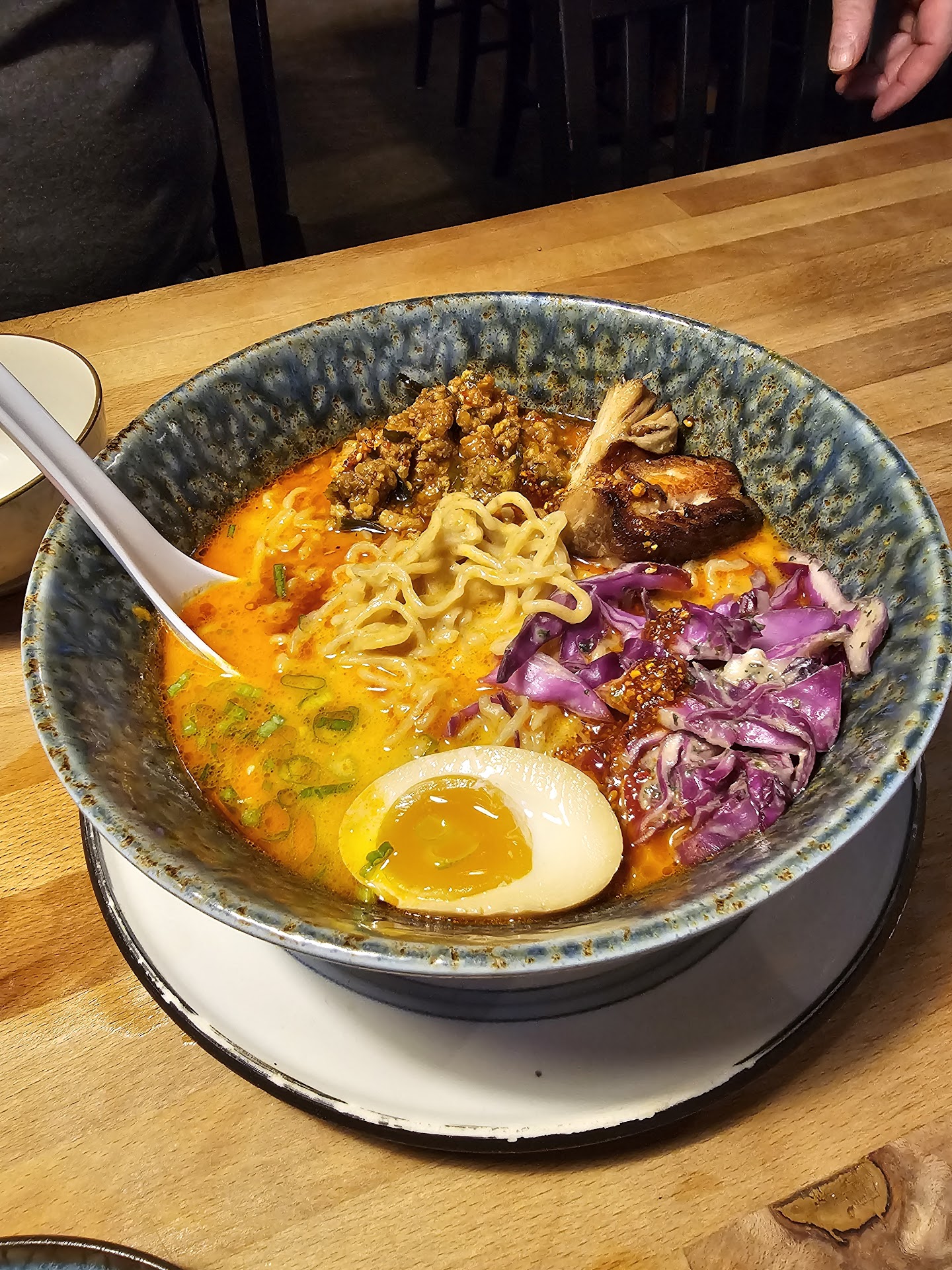 Food came out very quickly and was very hot and fresh. The pork sliders? The bread is made in house and you can tell. Super fresh, soft, delicious. The pork sliders are an absolute must, though there's two, so if you have a larger party I would order 2 orders. The spicy tantanmen was incredibly rich and had a very good spice level. It was too spicy for my wife but if you like spice, I would totally recommend it. The pork belly was soft and delicious, and the egg and noodles were cooked to perfection. The beef stir no fry is brothless, so make note of that if it's your play. The noodles are so incredibly fresh and delicious. Beef was well seasoned and tasty. We ended the meal with a small peach creme brulee, which was a very interesting take. Crunchy top combined with the rich peach custard was unfamiliar but absolutely divine.