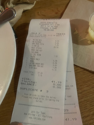 Read moreIt was the worst place and will not go back. The fries were cold and uncooked and the waitress was trouble. The wait time was unexpected. I would not recommend this to anyone. I live so close and I will not go back. I hope you get better manager and better server that care about the customer. There was only one waitress that work her butt off and her name was Megan and wish we had her. I order something the was a special and the waitress had to go and check if they had it and it too long to find out if they had it and why offer thing you don't have. Other people were upset with and waitress. We were trying to have a good night out but it way the worse night out. We will have try other places to have a good night out. You need more bartenders on the weekends because it sports times and more servers.We go to Ohio and they have better bartenders and the bartenders help out with tables went they are not busy. I love Ohio applebee's. They are very friendly and they go over board to keep they customers happy even when it sports season. I am not driving five hour to go to a good applebees. I upstand when restaurant close because of bad serve. I hate to see that happen. There is no reason for for table to empty when the waitress does not want to do her job. There were a lot of tables that could have been filled. It took one hour to get a table that could have been seated earlier if you had a good host and good waitress. Ohio' has wheelschairs accessibility but crestwood doesn't. My husband and I have medical problems and we had to use staire. They tell us that they had a ramp. My husband is on a cane and I have a knee brace and we have a hard time with stairs and high tables. All the door were locked and the customer had to let us in while they wait and went we told yhe manager she opened only one Door and people had to open the other door for customer or tell them to us the other door. This happens in crestwood , Illinois . The door that should have been open lock was the one by the driveway. I hope other people don't have to have an experience that we did. I wish more people would speak up. Maybe something will happen then. You want feed back you got it. Don't think we will be back for awhile. Unless thing change. Thank you for listening to people that like to go out for a nice dinner and be treat like they should be treated. I wish corporate would listen to the small hard working people instead of seating in a big office and not know what is going on there restaurant. Thanks for listening to the...