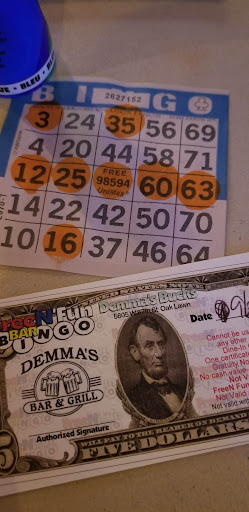Ā Ā Ā Read moreI found a neighborhood gem in Oaklawn.! I was at Demma's Bar & Grill to play free bingo on Monday at 6 pm. The people are kind. The environment is for individuals who want to have fun and be stimulated by activities that you can engage in, such as pool, darts, slots, machines for gaming, and last bingo on Mondays. I ordered the patty melt w chips. The cost was $8 plus tax. I paid with a debit card.. Fifteen minutes later, the food was brought to my table by the cook Sue. The patty melt was made with butter grilled, rye bread , grilled onio.ns , and cheese. The taste was amazing! It is a husband and wife, family owned business. It is more than just a bar. The owners give to its communities by having free food on holidays and Chicago Bears games . In addition, they help sponsor an event called Big Bikes for Little Tykes helping kids with cancer. Last, this place has annual food drives for local churches and food pantries. This friendly environment is a great place to visit . In conclusion, every Tuesday and Friday is a free poker network for free Texas holder torments . ...