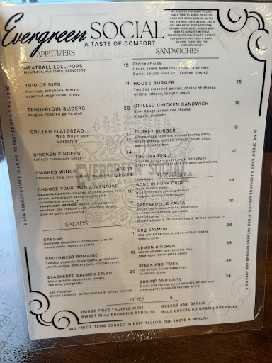 Read moreI was invited to Evergreen Social for a family member’s birthday dinner. It was our first time at the restaurant. I arrived later. Appetizers had been delivered: Dip Trio and Meatball Lollipops. Both were very good. I particularly appreciated the soft texture of the meatballs. Dinners came out as they were ready, not all at once, and received mixed reviews. The first was the steak-topped fries. She enjoyed the steak but reported the fries were salty. Next were the shrimp and grits and chicken on rice. She ordered it with no pork. She liked it and finished most of it, although her sister said the grits needed salt. My cousin enjoyed his chicken but reported the rice was not properly cooked. My daughter only wanted the truffle fries, which were well-seasoned and crispy, but she didn’t care for the truffle aioli. I also ordered the shrimp and grits but with the gravy on the side, concerned for the spice level. The waitress spoke with the chef and confirmed that wasn’t a problem. My shrimp and grits came out looking very appetizing. The shrimp were perfectly cooked and nothing was too spicy. We played a few rounds of Jinga before requesting the bill. A few adult beverages had been ordered. There was a major discrepancy regarding a specialty whiskey ordered before I arrived. A couple heard the waitress say $30 but the bill reflected $90. We brought it to the waitress’ attention but she insisted she said $90. My cousin didn’t want to challenge it. We paid the bill but that put a damper on the experience. Overall, we agreed we were glad to have tried Evergreen Social. I appreciated the chef’s flexibility, adapting to the customer’s needs, given the...
