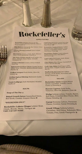 Read moreCame here for my dad’s birthday and I’m kind of disappointed. Honestly we all were. I looked at the reviews before coming here and heard about 50/50 of it being really good and really bad. All the dishes were priced way too high for some low quality dishes. The Rockefeller oysters were good, hence the name in the title of the restaurant. The tomato bisque was good, but just a tad too sweet. Everyone else’s meal was good except when my dad ordered the porterhouse steak which was $68 and definitely not worth $68. The first time he ordered it, we said medium rare. The waiter brought it to us the first time and it was completely well done. Then we sent it back and he brought it out again and it was still well done so then they had to send it back. Then for the third time, they finally brought it out to the correct way. but my dad said that it was probably one of the worst porterhouse steaks he’s ever had. Their au gratin potatoes were good, and the mushroom side was a little salty. Overall, I just wouldn’t recommend coming here if you’re looking for a good steakhouse. Maybe their oysters are good but everything else not so much. I think they need to lower the price for the quality of the food. One more thing, at the end of the menu it says no sharing or else they will charge you $8 dollars which I thought...