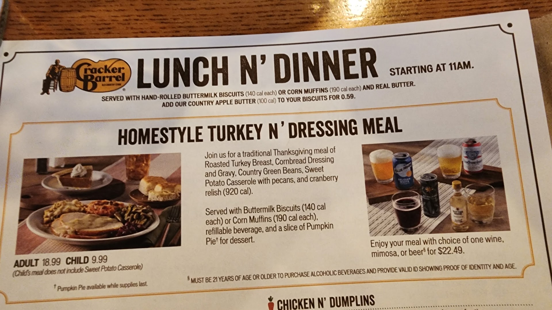 Read moreI ordered chicken and dumplings with three sides; mac and cheese, pinto beans and carrots. My girlfriend also ordered the chicken and dumplings, her sides were mashed potatoes and the loaded baked sweet potato. The chicken and dumplings were grey and sad and the only seasonings present were the salt and pepper we added at the table. The ratio of dumpling to chicken was obscure and it felt like the meal was shipped frozen, prepared in large volume and kept warm. The mashed potatoes were likely potato flake and water and had an unpleasant consistency which I've never experienced. The pinto beans tasted as if the line cook opened a can of beans and a can of precooked pork, mixed the two and microwaved for 3 minutes. It was dry and without seasoning and the only flavor came from the beans. The sweet potato came with two giant melted marshmallows that made it difficult for my girlfriend to eat. Watching her navigate the giant heap of gooey marshmallows made me laugh, but she felt uncomfortable, awkward and messy. The mac and cheese was cafeteria style and was similar to what you could find in a microwave dinner. It wasn't bad and I actually finished it. The carrots were the best part of my meal. This was cheap food in two senses: 1. Cost, this food was literally cheap. 2. Quality, this food was figuratively cheap. I'm not a fine dining expert or master chef but I can tell that the quality of this food was less than what I'd consider to be satisfactory. Even my waiter seems to know that the food was unreasonable. He was a very kind, polite and attentive young man but at the conclusion of our meal he didn't even ask if we wanted to take anything home. Almost as if he knew we wanted to distance ourselves from the food and the restaurant and forget the entire experience. Simply, I wouldn't recommend this restaurant to a single person I know, I wouldn't return to this establishment or any other restaurants belonging to this chain and I'd actively advocate to my friends and family to not dine here.