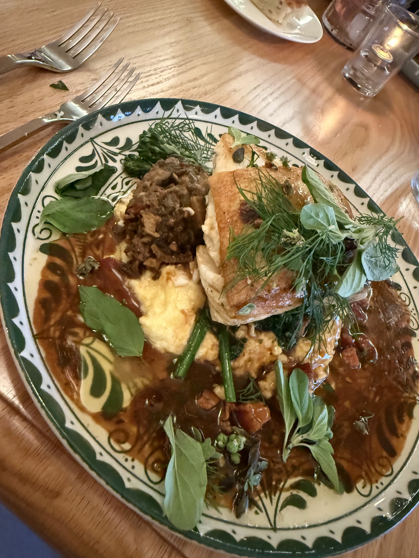 The real star of the evening was my wife's halibut - easily one of the best fish dishes we've had in Wilmington. The fish itself was flawlessly executed with beautifully crispy skin, but what made it extraordinary was how all the components worked together. The eggplant and olive caponata, buttered polenta, charred broccolini, and pancetta just created a symphony of flavors that elevated the entire plate.
