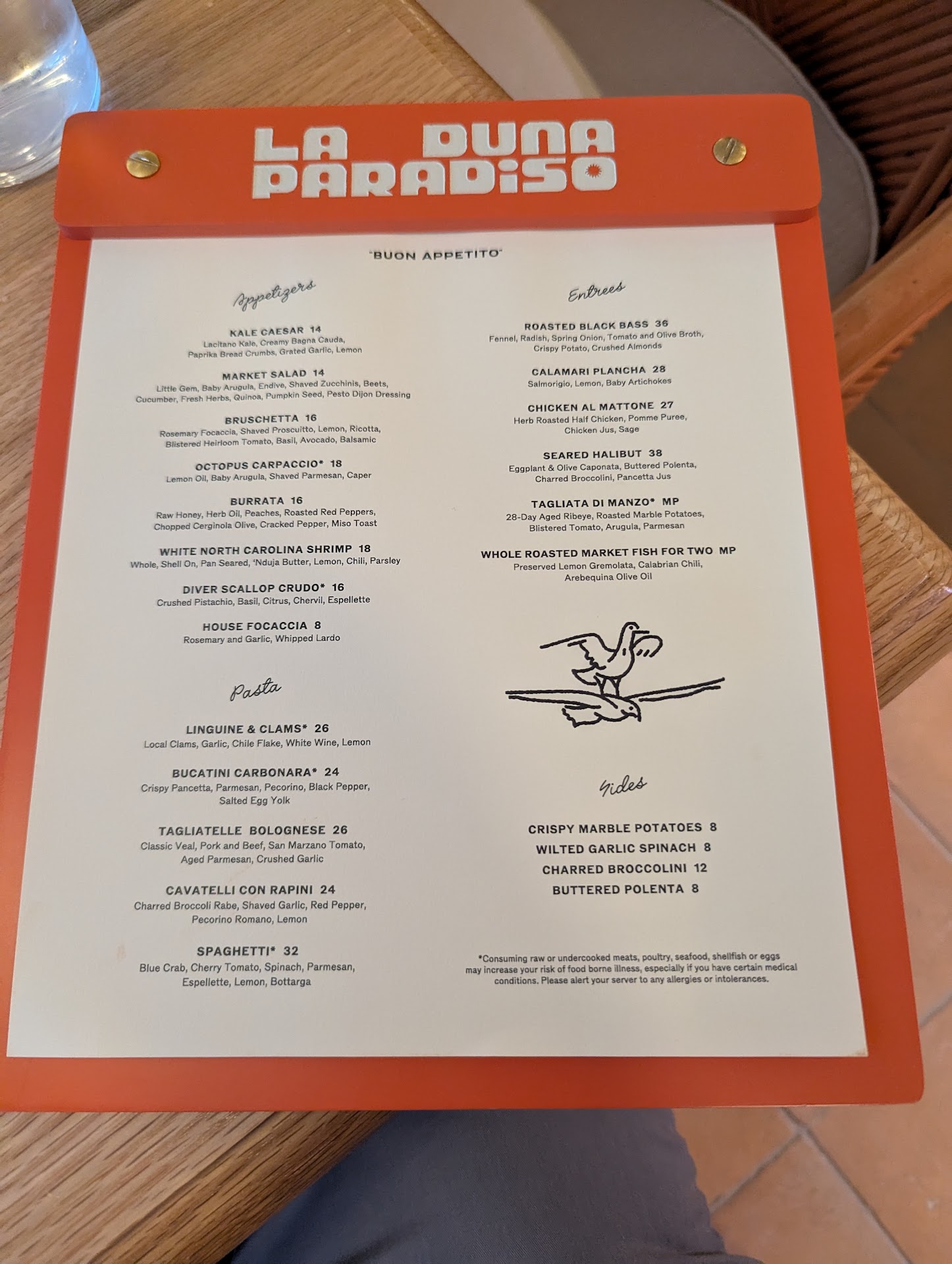 Read moreLa Duna Paradiso delivered an outstanding dinner that exceeded our expectations. We began with the kale salad and focaccia bread - both excellent starters. The salad was perfectly fresh with just the right amount of dressing, never overwhelming the greens. The focaccia was warm and fresh, creating a nice complement to the lighter salad.
