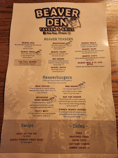 Great little restaurant in a great little town. Menu is all thriller no filler. Every time I have tried a daily/weekly special, be it Taco Tuesday, Italian Beef Wednesday, Fried Chicken Thursday, Friday Fish Fry, or Prime Rib Special on Saturday -This place doesn't miss. Salad Bar is lit, catch it Fridays thru the weekend. Edit: I am a bit of a Prime Rib Special Fanatic, seeking it out at various establishments on various day trips. I would pit Beaver Den Prime Rib up against other noteworthy area competitors - Art & Alma's, Sorrento's - all put out a fabulous Prime Rib. Where Beaver Den excels in the absolute attention to all other delicious sides, horseradish sauce, salad bar, etc.. I'm not absolutely sure it is the least expensive, I would have to check prices, but I'm willing to bet it is - either way the value is the best in terms of fast, friendly service, with ALL the fixings just right, in an unpretentious atmosphere that is more or less a Mashup of supper club and favorite hometown bar. Mind the kitchen hours for food, but the bar is still open in...