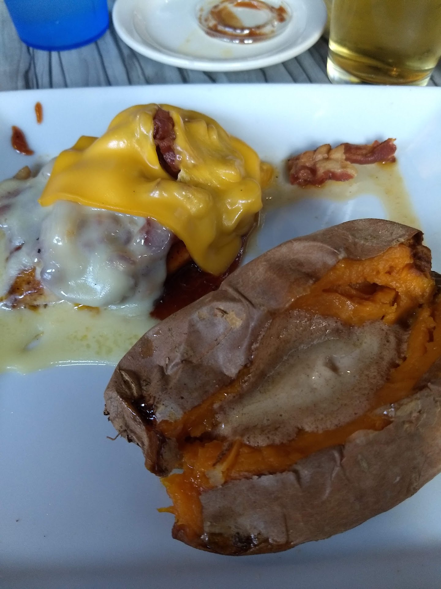 My husband ordered the 6 oz sizzler and rib combo with loaded mash potaoes and mac n cheese. I ordered the 8 oz sizzler with boursin cheese, added the shrimp scewer, steamed broccoli and mashed potatoes and gravy. So a pretty good sized meal. I usually eat my shrimp and save my steak for the next day for lunch. Usually because by the time I get to it, I'm so full from the other great food.