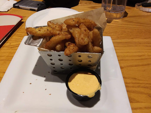 Read moreIn a twist on the prevailing norm the onion petals arrive in a metal box (or possibly an ineffective cheese grater), which is itself on an oversized square plate. The box is just the right size to contain the volume of the petals, overflowing every so slightly. A delicate sprinkle of what I can only assume to be a proprietary blend of Chili's seasoning coats the top layer, perhaps providing an extra boost of flavor. The accompanying "Blossom sauce" rests in a standard ramekin, albeit with some leakage reaching over the rim.