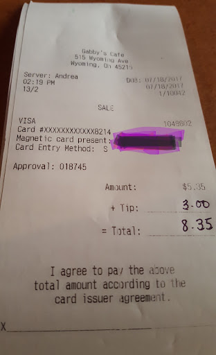 Gabby's ownership. You put your waitress Andrea in a bad situation. At 1pm, she had 4 booths with 2 people, a group of 8 ladies, plus running the bar area with 8 patrons. I felt sorry for her but on the other hand, Andrea could have made her situation better with us by saying a few helpful things like, I will be with you in a minute, or even apologize (which she did at the end) and let us know that we have not been forgotten. Here's my timeline: 1pm Greeted Promptly 104 sat down waiting on a friend 109 friend sits and orders water 129 No one came to table, no water , then I spoke to the gentleman (forgot his name) who sat us down about no service 139- water comes- 30 MINUTES to get water- unacceptable in the restaurant industry---at this time we noticed 2 gentlemen at bar area sat 15 mins after us and already had their salads Andrea takes order only for the cincy burger special. She did not ask if we wanted anything else with our meal , nor did she ask how we wanted our meat prepared. It automatically came well done 151- food is finally here. Andrea sits food down and literally walks away. ( mind you is she not being mean nor did she have an "attitude", but she seemed overwhelmed) 210- 20 minutes passed before she checked back with us to see if we needed anything. 213 - We check out and I leave a 56% tip because I know we all have BAD DAYS but geez!! see...