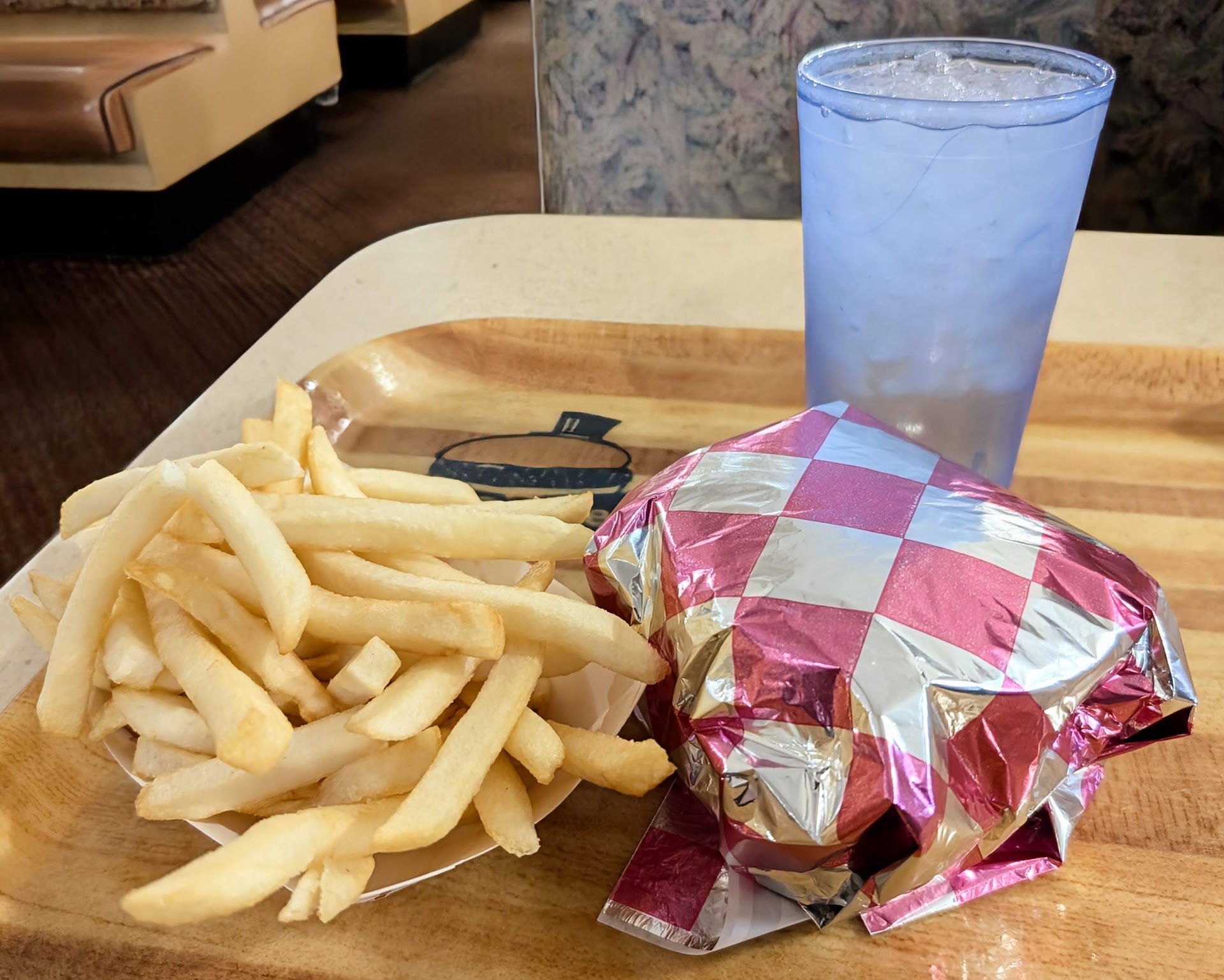 The onion rings, on the other hand, leave more to be desired. The smoothness of the batter, and the consistency of the color, usually indicate that they’re frozen, but the cracked patchiness of the batter makes me suspect they’re made by hand, however poorly. Broken rings litter the bottom of the sack as I cradle it lightly in my car, careful not to cause any more disturbances.