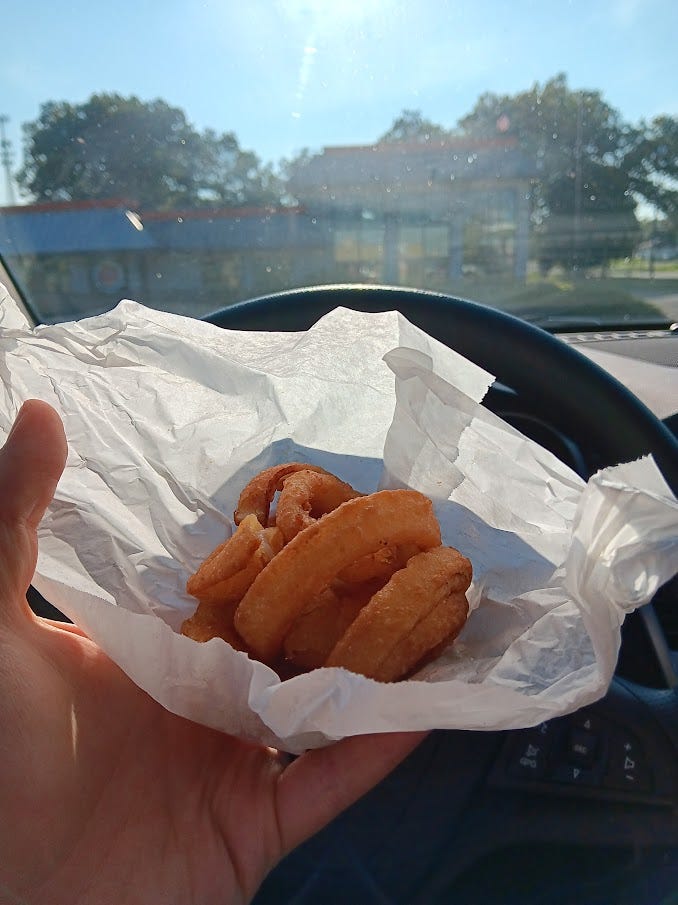 The numerous gaps in the batter have the singular benefit of unleashing the onion aroma lurking in its coffined battered walls, slowly filling the front seat of my car with the fumes.