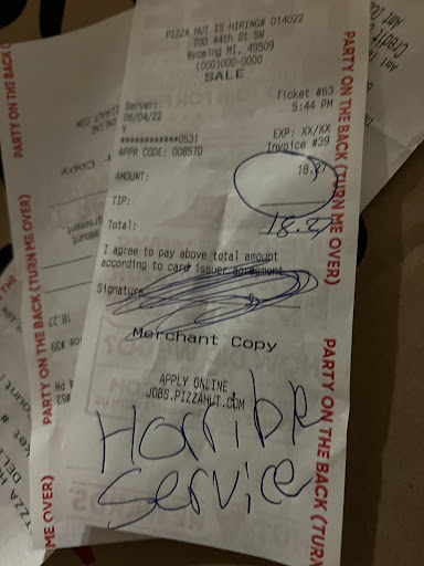 Read moreBe aware that Pizza Hut âs App wonât take an order if the schedule time is closed. I placed an order at 10:57 pm. Got confirmation Pizza will be ready in 14 minutes. Iâll drove to the location on 44th St.,& Clyde Park by Wyoming Michigan 11 minutes after. A lady manager has closed the doors and was yelling from the inside out âwe are closedâ. It was freezing snowing, and I was trying to explain âI placed an order, I got a confirmationââŚBut she was neglecting assistance ! She kept on screaming from the inside âweâre close weâre closeâ. A gentleman came out, open the door and was as thoughtful to check on my cellular and confirm that I certainly have an order, properly placed. However, he was manipulated by the lady and he end up stating that , âyes, sorry but we are closedâ.duhhhhhh, might as well, why would you even bother???? I was sooooo disappointed because of the poor quality of service. I wasted time, energy , gasoline and they really ruined our dinner. Iâm a frequent customer and I wouldnât settle for less than respect. I couldnât believe they can date to mock customers like that. UNACCEPTABLE! So I received a survey that how was my dinner ? which is proof that that order was placed properly, â but the manager or lady in service was selfish and neglectedâ to provide the service she committed to when she was granted to the opportunity to work as a Pizza Hut representative and thatâs totally unacceptable....