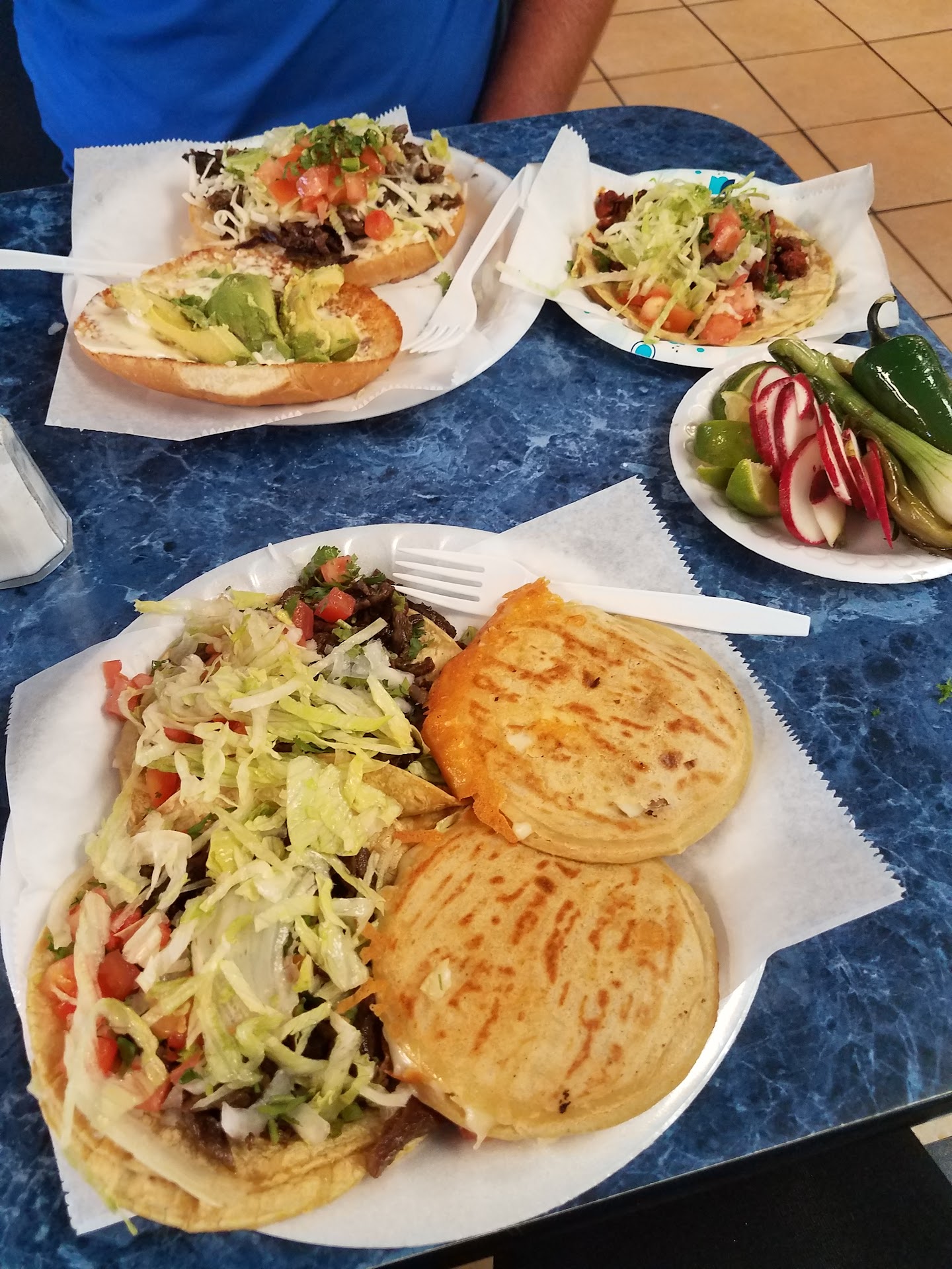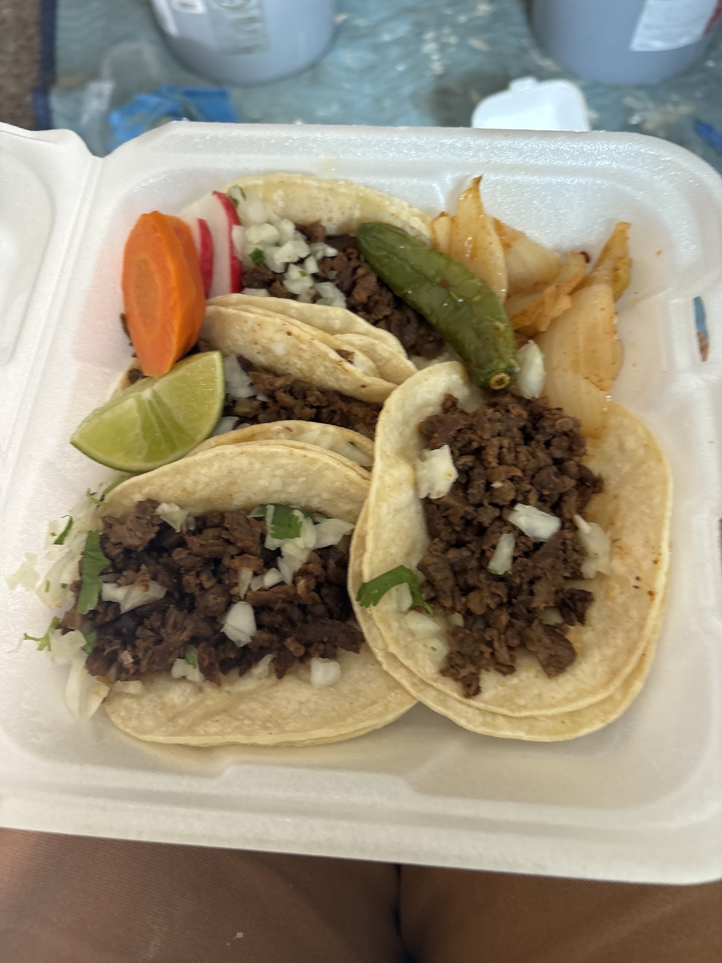 Great food, large portions. I ordered a veggie nacho and a chicken taco. The nachos were about 8$, so I thought it would be small. I was wrong. I had enough leftover to make a late-night 4th meal. The salsas were solid and a little bit spicy, so I kept piling it on as I went. They also sell sides of grilled onions. Get these with a couple of tacos, and you'll have a great meal. They are the large green onions, seasoned well. A great addition to any meal here. They also have aqua frescas, so order an Agua jamaica to take the occasion over the top. Cheap, delicious, and great...