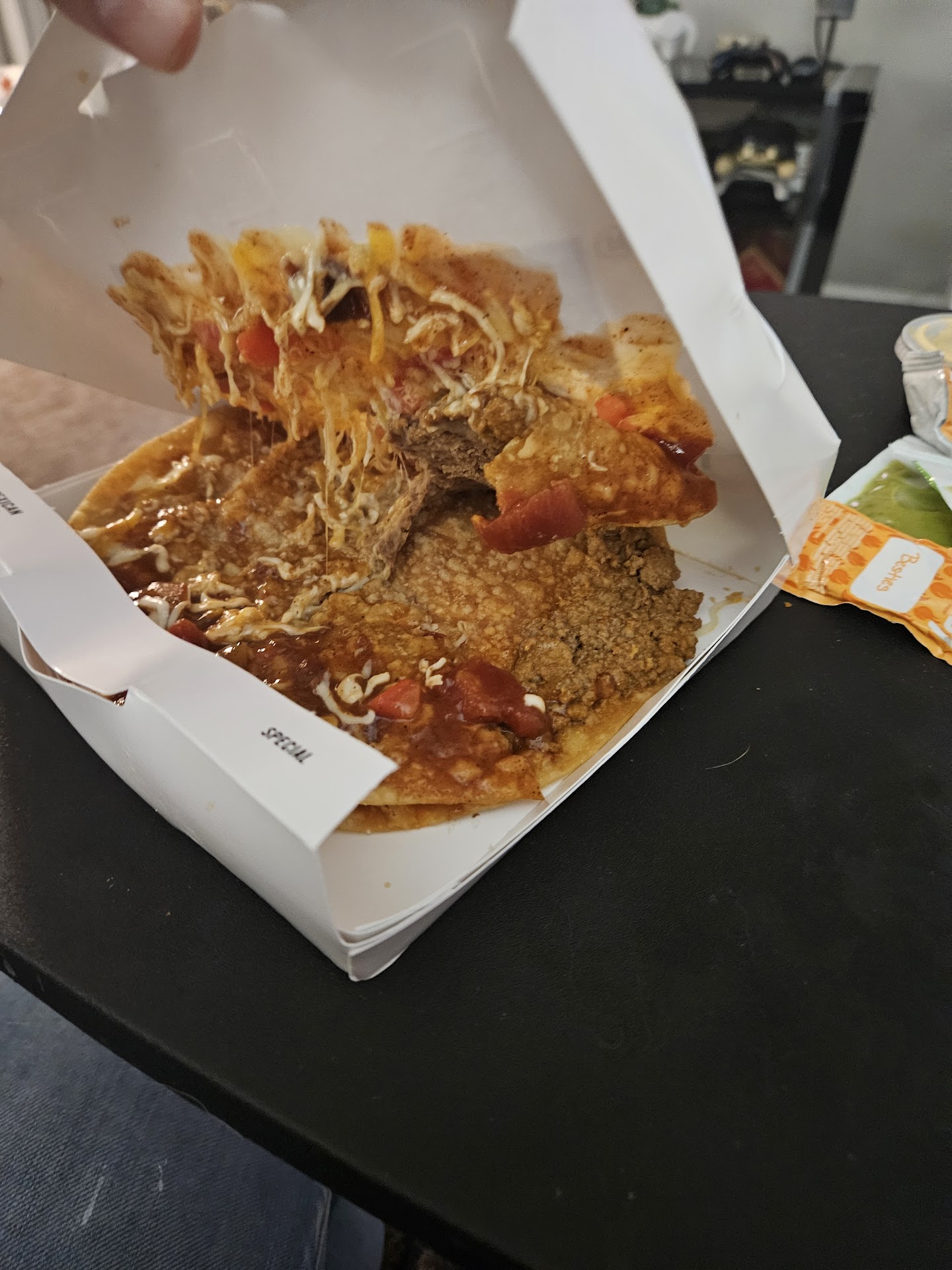 Me and my dad ordered a mountain of cheesy bean and rice burritos. like, i'm pretty sure they had to use a full pan of beans on our order, for real.