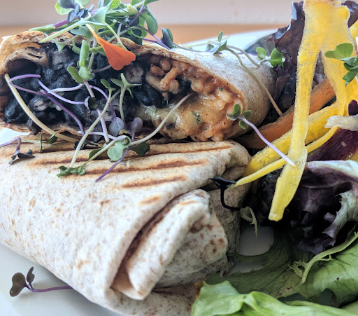 When our food arrived we were starving so I ate one of my plant based breakfast taco before I could snap a picture. My husband was eating half of his bacon and egg breakfast burrito too. The food was delicious but the portions were tiny for the price and no sides except silly microgreens. We both could have eaten a second serving of each of our orders. If there was a side of potatoes or chips to fill you up more that would be greatly appreciated.