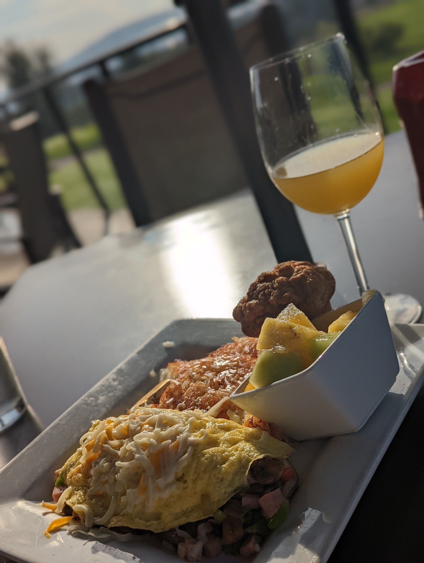 The atmosphere was the best part of our meal as well as the gentleman that was over the omlett bar. He was very personable and would go out of his way to make whatever you asked. The buffet was just what you would expect from a simple breakfast buffet, waffles in a warmer rather than freshly made, biscuits and gravey, scrambled eggs, ham, sausage, bacon, eggs Benedict on a raw english muffin, simple previously frozen deserts; absolutely not what I had expected. I've had better breakfasts when I've stayed at a Hilton, there the waffles are made to order on the breakfast buffet. Our waitperson was rude and made us feel that we didn't belong. I don't drink soda, had enough coffee already for the day, when I told her I was fine with water she rudely told me that "drinks come with the meal and I wouldn't have to pay any more for them if that's what I was worried about." I was shocked and in disbelief that she had the nerve to say that. Then she would ignore us for great lengths of time and act like she didn't see us when we tried to get her attention. Not long after we sat down, 2 couples and a child sat at the table behind his. She doated on them. She took my empty plate and asked me to keep my silverware. I had nothing to put it on other than the table, which I would never do or my napkin. I placed them on my husbands plate. When she took the people's empty plates behind us, she requested their used silverware and promptly brought them clean. She regularly filled their water and drinks but never offered to do so with us. I could hear the line cooks talking about their recent dates, which is also not something I care to hear about when I'm out for a meal with my family. There was one other positive. The host was very nice and made for a positive beginning and a happy exit. They need more staff like her and the wonderful gentleman at the omlett bar and fewer of the older, brunette waiter person. She is a disservice to...