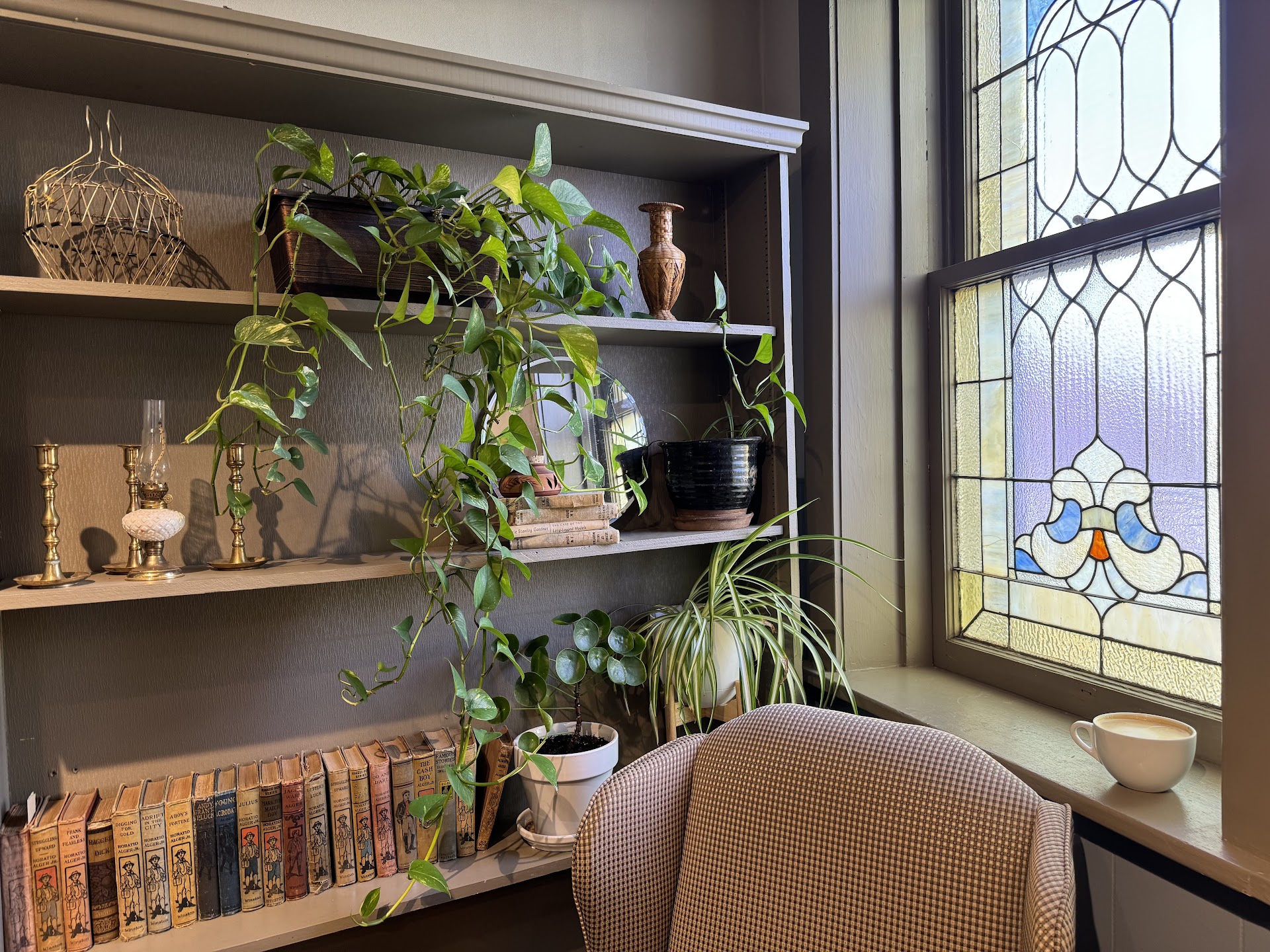 I recommend the cozy nook with the stained glass windows, a truly special coffee shop experience.