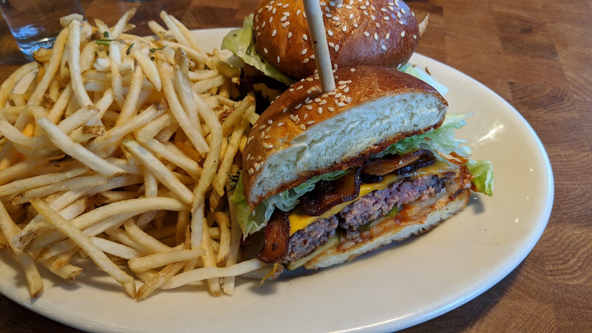 Read moreOrdered a burger well done, it came out mid rare. They serve these cut in half, so it should have been completely obvious. A runner delivered the food and was gone before I noticed the undercook. Waited for waitress, but she did not come back around. I ate the outer portion of one half that was cooked through, and ultimately split my wife's meal. When the waitress finally made it back, I let her know the burger was under, but at that point I was not interested in sending it back. They took it off the bill and the manager apologized. Things I did like: atmosphere is pleasant. The entry door is a huge wooden structure that is really interesting. They've got firewood stacked around, but I'm not sure that they cook with it, it looks decorative. I don't care for the way they serve water -you get an 8oz juice glass and and old fashioned glass milk jug with water in it, and you get to refill your own water without ice just about every time you take a sip. When the waitress came to introduced herself, she just asked if we "wanted anything to start." Neither my wife or I were sure whether she was asking for a cocktail order, appetizers, or even our meal? After she asked, she didn't say another word, just left is in uncomfortable silence, even though it was pretty obvious we were looking for some guidance. Sounds weird to talk about, but discussing t it later with my wife, we both thought it was strange. My wife enjoyed her meal (the part that I...