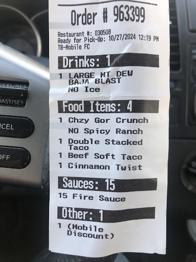 Ā Ā Ā Read moreI was very displeased with this particular Taco Bell. First, whoever designed the parking there really needs to rethink that one. Where you pull in to pick up a Mobil order you either cannot park there or you canāt get out due to the drive thru literally going right past those parking stalls. Secondly I ordered through their mobile app and when I went inside to pick it up I had to wait over 10 minutes. There were literally 5 people in the restaurant and 2 cars in the drive thru at the time. Then my order wasnāt even complete. They forgot my cinnamon swirls, my 15 fire packets and napkins. The food looked like it was literally just slapped together quickly and thrown into the bag. I was just on my lunch break at work so good thing that I didnāt go through their drive thru to pick up my INCOMPLETE order that I spent my hard earned money on. The receipt that they stuck to the side of my bag (order) was very clear literally IN black and white. Looks like some of their employees need to be either trained or retrained properly on reading/comprehending the orders correctly. This is not the first time that Iāve encountered horrible service at this particular Taco Bell by the way. The staff also seemed to be very unhappy nobody was smiling. Nobody welcomed me in or thanked me after I received my incorrect order. The Taco Bell on 72nd Avenue has a much friendlier staff and are pretty much spot on getting my order correct the FIRST time. Burger King does a much better job at following directions and getting my order correct Iād say probably 99%...