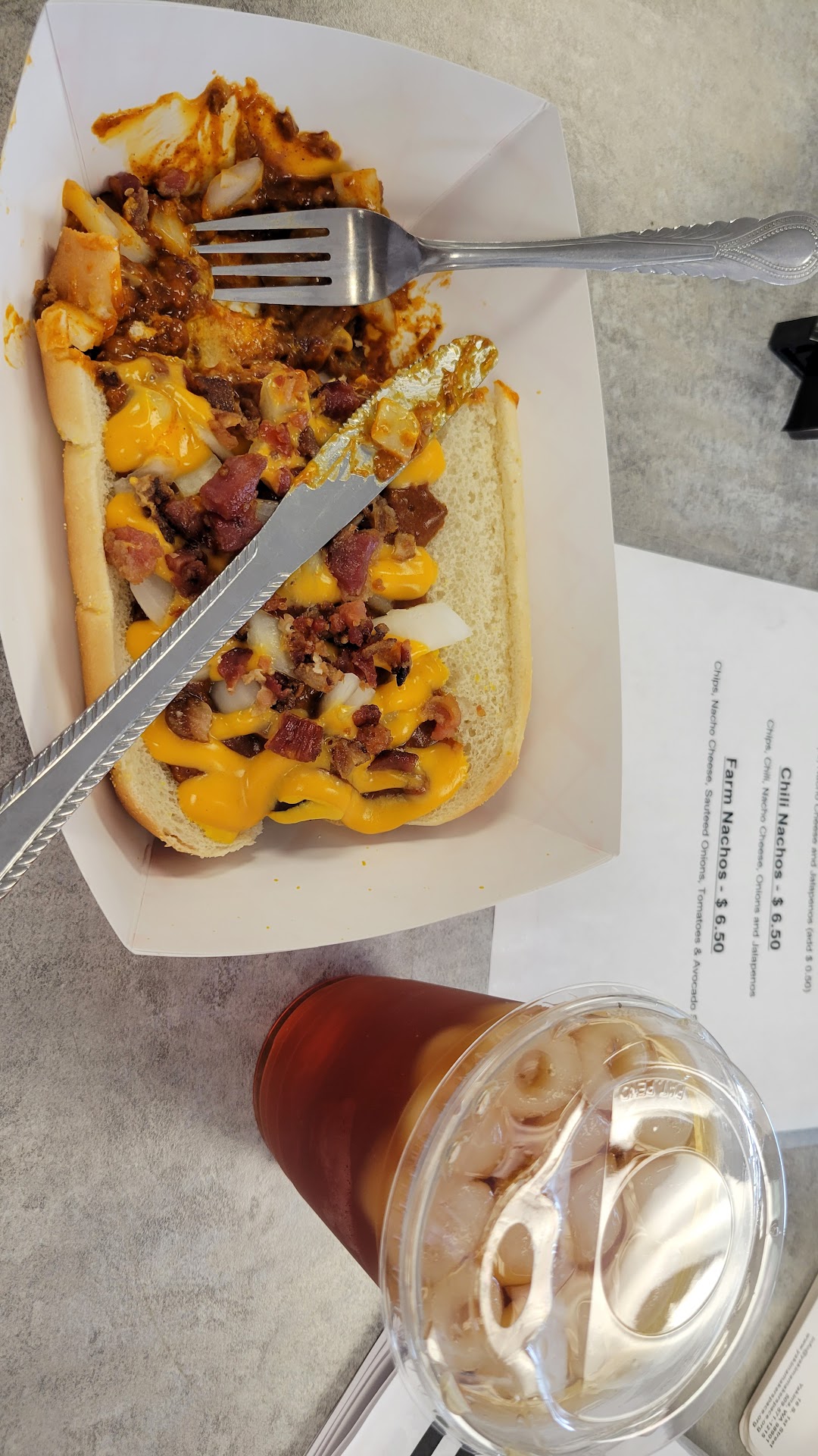 Read moreFood/Taste/Flavor: 4/5 - overall was good but there wasn't anything special about it so it felt like something anyone could create. Monster Nachos were chips with chili, nacho cheese, fresh onion, tomatoes, green peppers, and jalapeños. The ingredients seem fresh as the raw onions definitely had a crisp bite. Since it was in a rectangular container, the toppings were sitting on top and the chips at the bottom were pretty bare