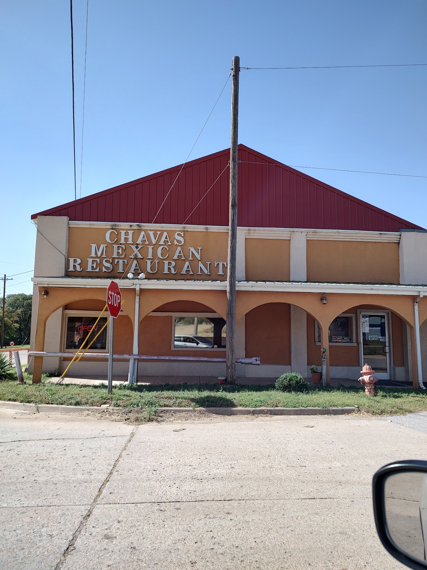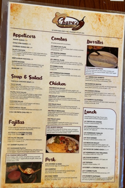 The massive building has a Spanish architectural hint and colors that suggests, Mexican food can be found here. It is now Chava’s. It covers almost a city block. This place probably rocked in the old days. The parking lot being full of oilfield worker’s trucks at noon during the week and family cars on the weekend. Now well worn, the neglected exterior matches the town; weeds, the structures only landscaping. Today, the entire declining population of Yale could probably fit in the building. The parking lot was vacant when we arrived.