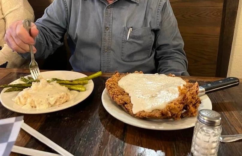 When our order arrived, we were quite taken back! The plating and garnish were equal to uptown Five Star restaurants! The asparagus was cooked and seasoned to perfection! The baked potato was actually a #1 baked potato also garnished like a carefully arranged photo for display. The meatloaf was a supreme delight! Incidentally, the meatloaf was NOT made from leftovers and the recipe was predictable unavailable, (but I did try!) My wife ordered a salad, beef ribs and seasoned French fries. Again, the plating was most tempting and everything served was a culinary delight! Darrell finished up our delightful meal with homemade cheese cake and home-made fried pies for dessert, also delectable. After “dinner” Darrell gave us a guided tour of his spacious restaurant and we took many photos. At Darrell’s command, we blew the motorhome air horn past the front of the restaurant all the way down the hill as we left! And yes, Darrell did buy our “dinner” and even left the waitress a twenty-dollar tip! We will be back Darrell!