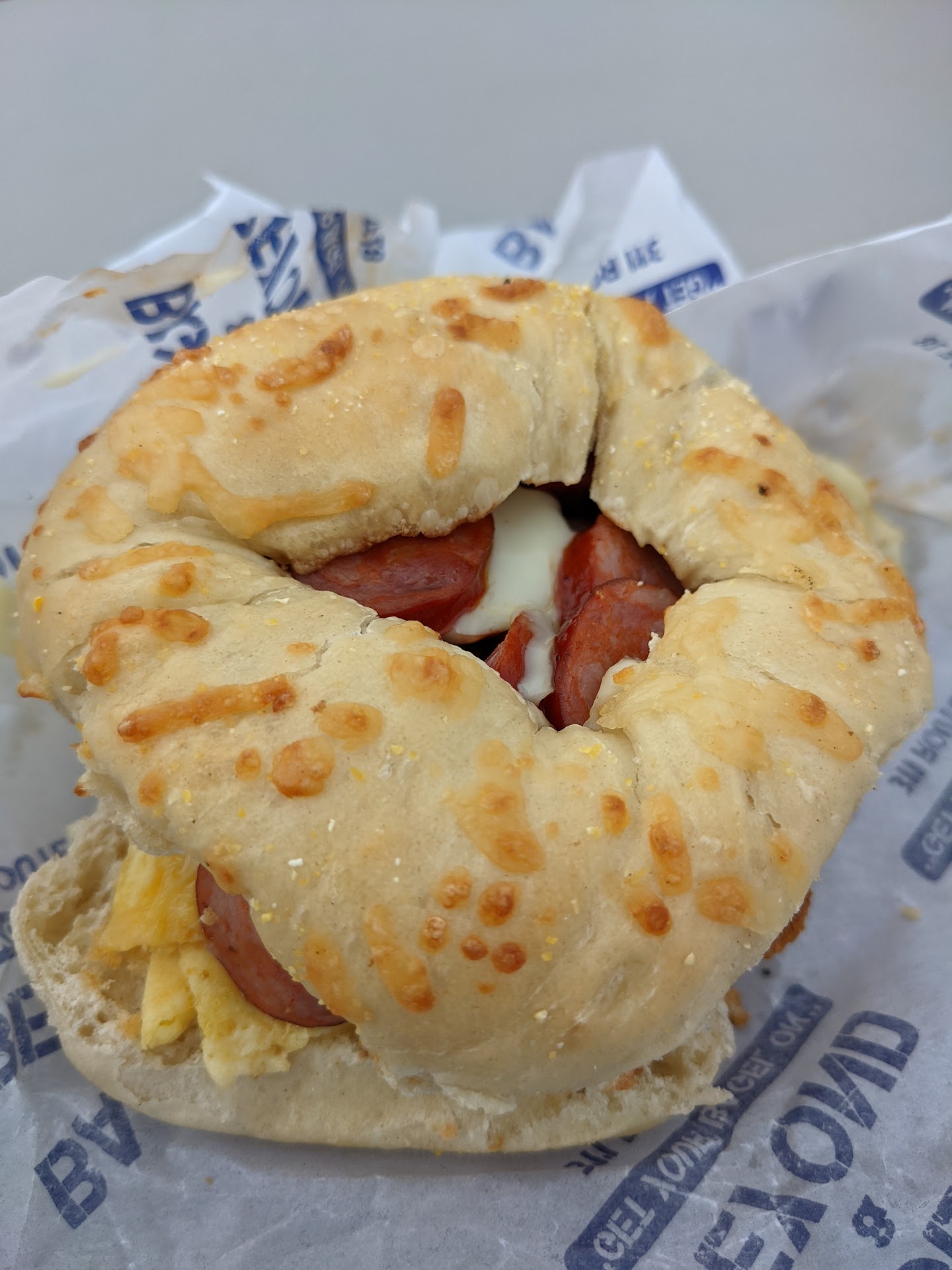 I ordered a sausage, egg, and cheese on an onion bagel and it was delicious. The sausage had great flavor and a little bit of spice (not heat, just seasoning), there was a good amount of egg on their and the cheese was well toasted. The onion bagel added great flavor to the sandwich overall and it tasted great on it's own.