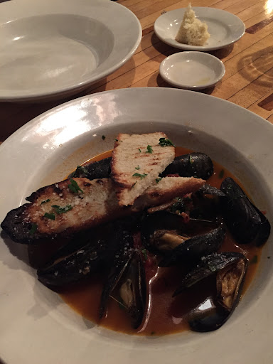 Our group sat at a long table in the middle of the room. The chairs were incredibly uncomfortable. Hard metal with no cushion and the way the back met the seat, I had metal bars pressing into my kidneys all night. Not particularly pleasant. The music drove me insane all evening. There was a guy playing a guitar and singing and it was way too loud. I couldn't hear anyone sitting around me and it made conversation very difficult. The waiter was standing right behind me telling us about the specials and I could barely hear what he was saying. It made for a difficult dining experience because we were all basically yelling at each other to be heard.