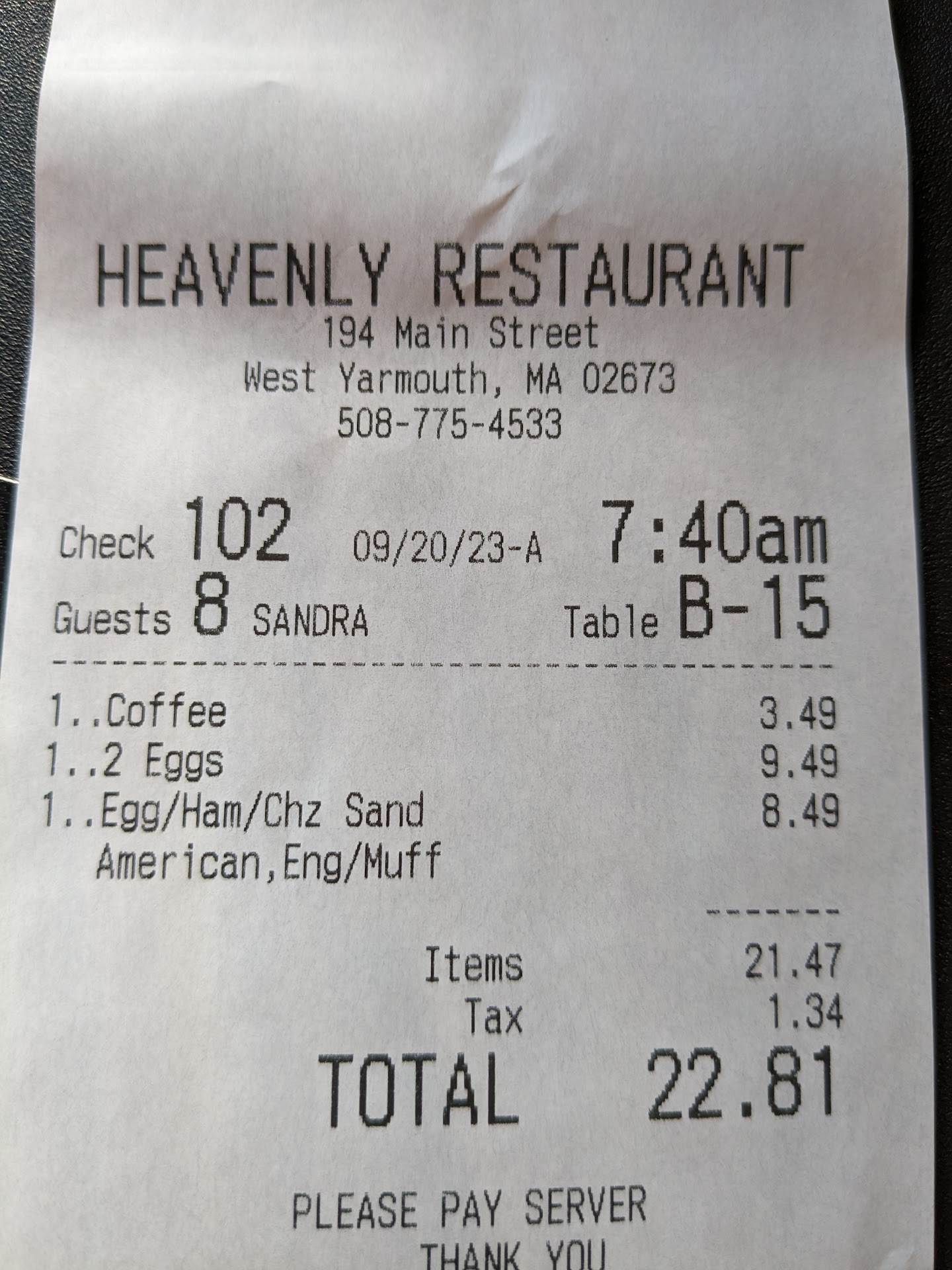 Read moreOrdered the cranberry pancakes. As soon as I started cutting them, I thought they smelled off. However, I tried them anyway and they tasted fermented. I stopped eating them and when the waitress came with the bill I let her know. I said it nicely, in terms of letting the kitchen know so they could check the batter. Her immediate response, rather than apologizing, was to say, "Well, we haven't had any other complaints. " First, this is bad customer service. Second, they open at 6:30am and we were there at 6:40am. If the batter was off, how many others had it at that time? Then, when she took the bill and card away, she sent someone else over with the receipts rather than return. To top it off, they did not remove the pancakes from the bill! I didn't even eat 1/4 of them. The customer shouldn't have to ask for removal of a bad, inedible dish. Left feeling nauseous (which I mentioned to her after the "no other complaints" comment) and will...