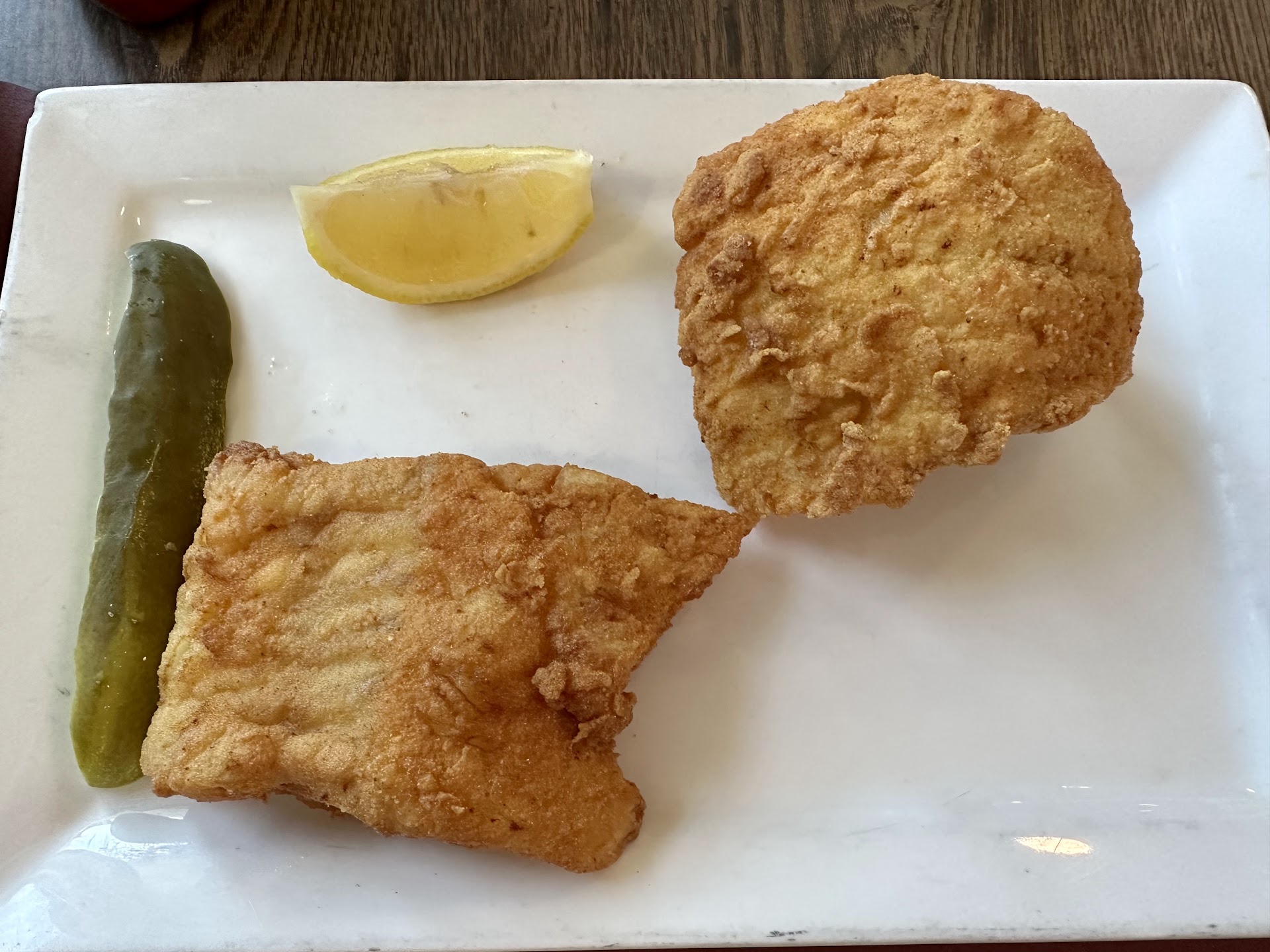 Eventually a plate of food came and the waitress said this is the fish and chips, it wasn’t. It was the sandwich. It came with fries (she blamed the kitchen) and so she gave me a plate to take the fries from my mom. My fish and chips (minus the fries since I had to take them from the other plate) eventually came 5 minutes later. One piece was good, the other was tough and not hot.