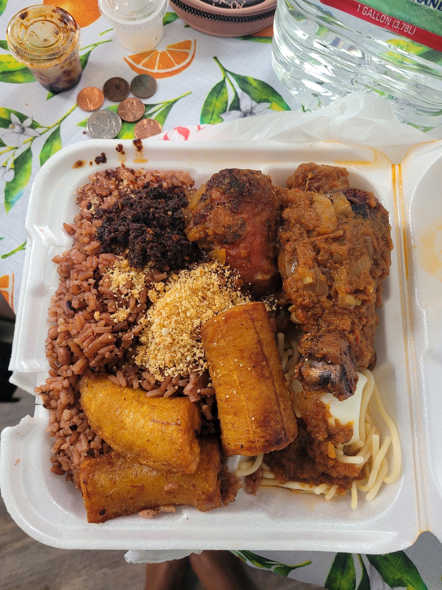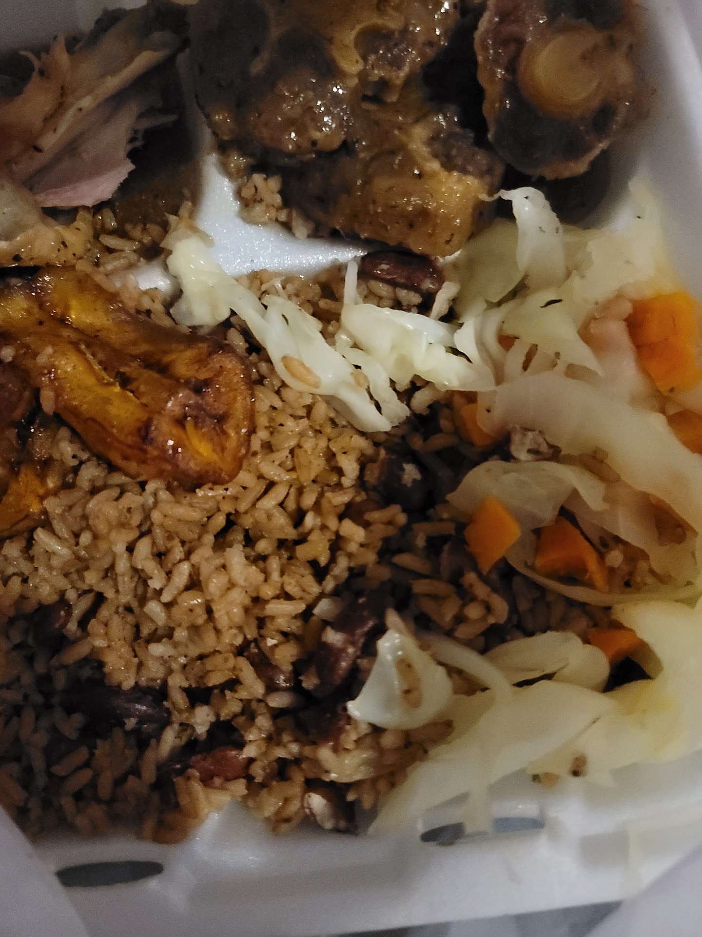 Food was gross. Tasted like a cleaning agent and had to throw the slop in the garbage. Portions incredibly small for the price. The number 3 must be their favorite number. 3 plantains were all the size of an orange slice. 3 baby oxtails that they cover with a bunch of thick disgusting gravy that has corn and peas-yuck. I didn't ask for gravy, I guess that's to camouflage what's really lacking. Jerk chicken look like one small chicken thigh that was cut into about 12-15 tiny pieces. 1 tablespoon of cabbage. Mushy rice and beans. A waste of 23 hard earned dollars. They deserve ZERO stars. NEVER EVER EVER will I patronize this establishment AGAIN. Oh by the way, the review that was given 5 stars with a great review, looks like one...