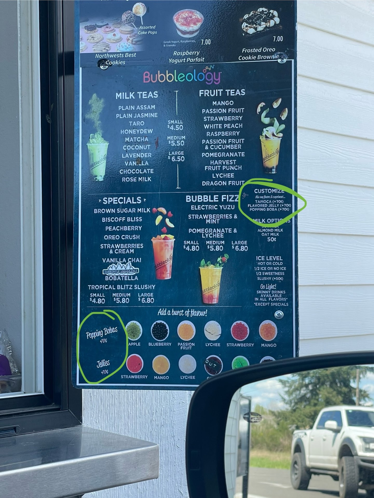 I took my 9 year old to go get boba tea as a suprise. She loves boba tea and was so excited when we pulled in to order. Pros Variety of boba tea drinks available. Fun drinks- this month was an amazing pink milkshake type drink called 'Carnival Ride'. The picture showed sprinkles, red licorice, cotton candy, whipped cream and a little cupcake adorning the top of this drink. Wide variety of food options. My daughter got a raspberry stuffed bagel. She said it was very delicious. Friendly Barista. Our Barista promptly took our order, made a little bit of small talk and we were on our way within 5 minutes. Fast service. From the time our Barista took our order to the time we got our order was within 5 minutes. Asthetically pleasing decor. The menu was easy to read, the building is beautiful, chalk artwork of boba tea inside the coffee stand and beautiful photo of the boba in a circle.
