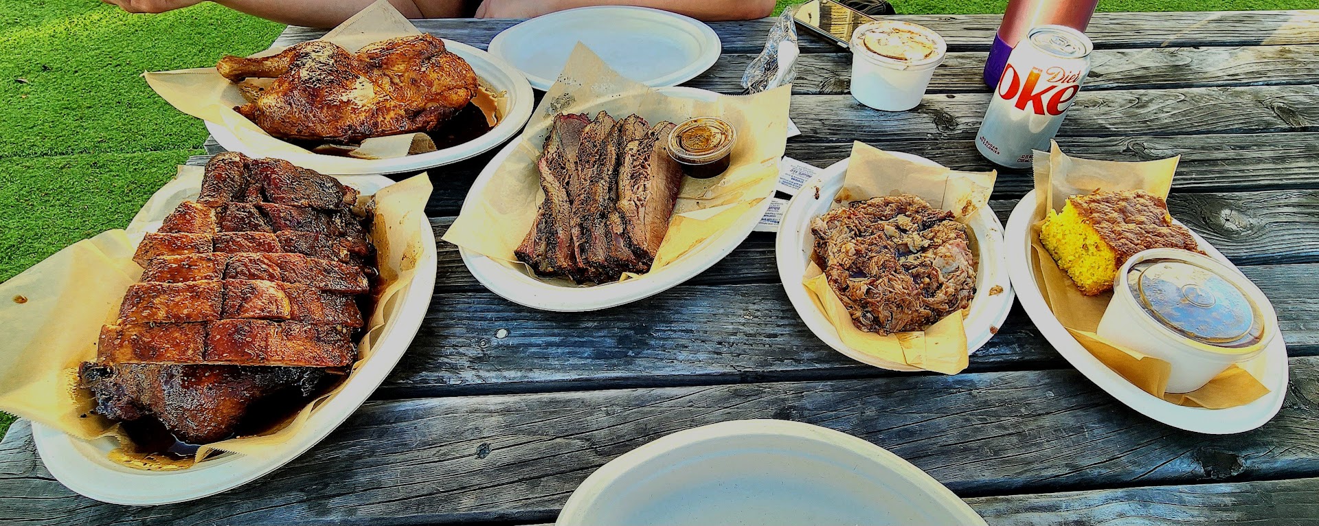 When I got there, I was told the best things on the menu was the brisket and the cornbread. Of course I had to get those, and on top of that I got a full rack of pork ribs, 1/2 chicken, baked beans, and potato salad.