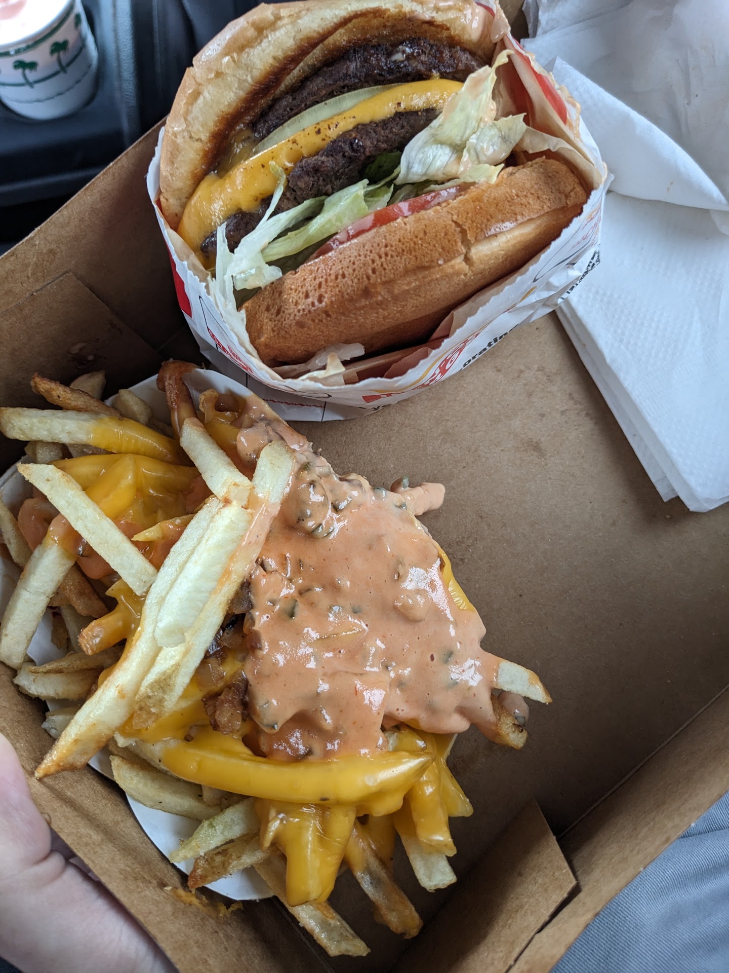 So we got the burgers on the way back from a trip so we hit up the drive thru. Someone walked up to our car in the queue and took the order and sent it to the team. By the time we pulled up, we got our food in a couple of boxes.